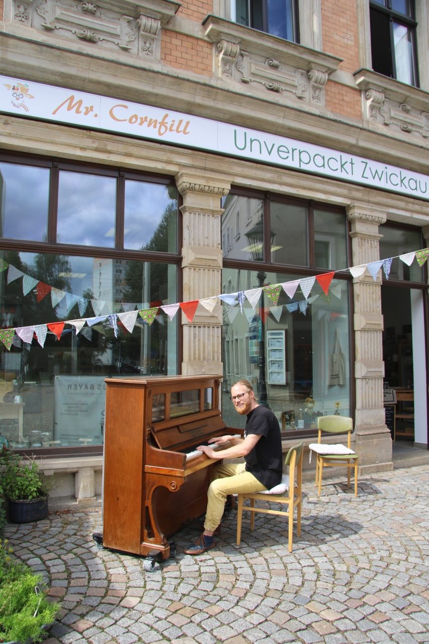 Nachdem die Stadtmanagerin zur freiwilligen Betreuung des Instruments aufgerufen hatte, haben sich zwei engagierte Zwickauer Unternehmer in der Innenstadt bereit erklärt, bei der Umsetzung des Projekts tatkräftig mitzuhelfen. Einer davon ist Michael Karl vom Unverpackt Laden Mr. Cornfill. Er sorgt ab sofort dafür, dass das Instrument – natürlich nur bei schönem Wetter – vor seinem Ladengeschäft in der Inneren Schneeberger Straße 12 während der Öffnungszeiten aufgestellt wird. Wer möchte, kann Montag bis Freitag von 10 bis 18 Uhr und sonnabends von 10 bis 14 Uhr einfach vorbeischauen und auf dem Instrument spielen.
