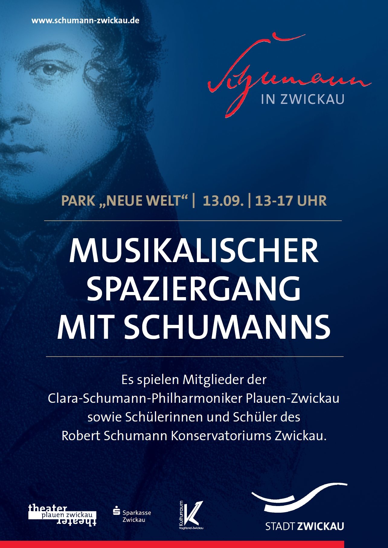 Der Park „Neue Welt“ verwandelt sich am Sonntag, dem 13. September zwischen 13 und 17 Uhr in einen „Konzertsaal“, in dem klassische Kompositionen und Naturlaute eine besondere Verbindung eingehen. An Clara Schumanns 201. Geburtstag lädt der „Musikalische Spaziergang mit Schumanns“ das Publikum zu einem besonderen Rundgang ein und sorgt gleichzeitig für eine neuartige Wahrnehmung der Parkanlage. An mehreren Stationen im Park erwarten das Publikum zahlreiche Ensembles in abwechslungsreichen, zum Teil überraschenden Besetzungen und Arrangements: So sind neben einem Streichtrio und einem Celloduo unter anderem auch ein Violinquartett, ein Flötentrio und ein Holzbläsertrio zu erleben. Dabei wechseln sich verschiedene Ensembles an den einzelnen Stationen ab, so dass das Publikum über die gesamte Veranstaltungsdauer die Möglichkeit hat, verschiedene kleine Konzerte zu erleben.