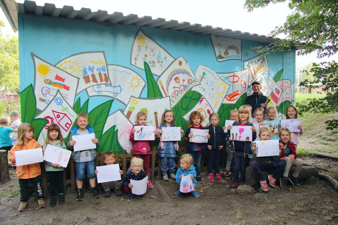 Ein ähnliches Projekt wurde bereits im Mai 2019 an der Hauswand der Kita „Krümelkiste“ in Pölbitz umgesetzt.