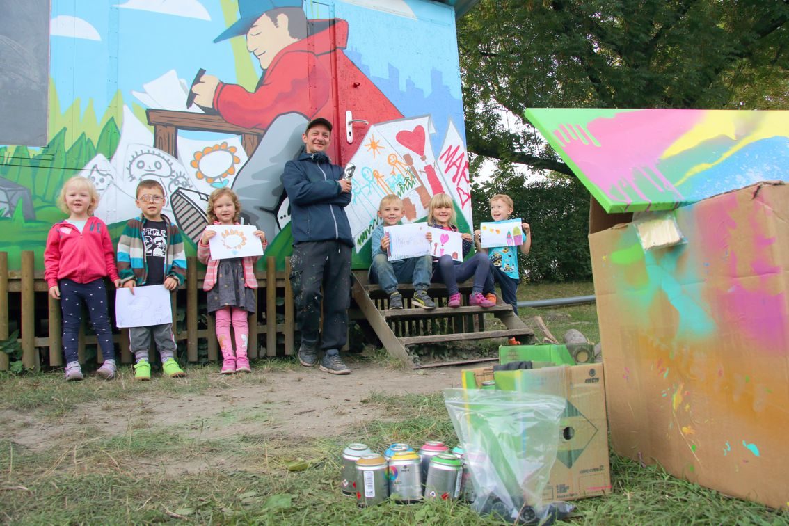 An die Wandflächen des Bauwagens übertragen wurden die Bilder von Rico Gruner. Das Kita-Team holte den Graffiti-Künstler Mitte September im Rahmen des Kunstprojektes „Jeder Kita einen Künstler“ extra dafür ins Haus. Schließlich sollten die kleinen Gemälde von Kinderhand auch fachgerecht und witterungsbeständig an den Bauwagen kommen. Auch hierbei durften die Kids mit Hand anlegen und sich außerdem in bildnerischer Gestaltung und dem Umgang mit der Spraydose schulen lassen.