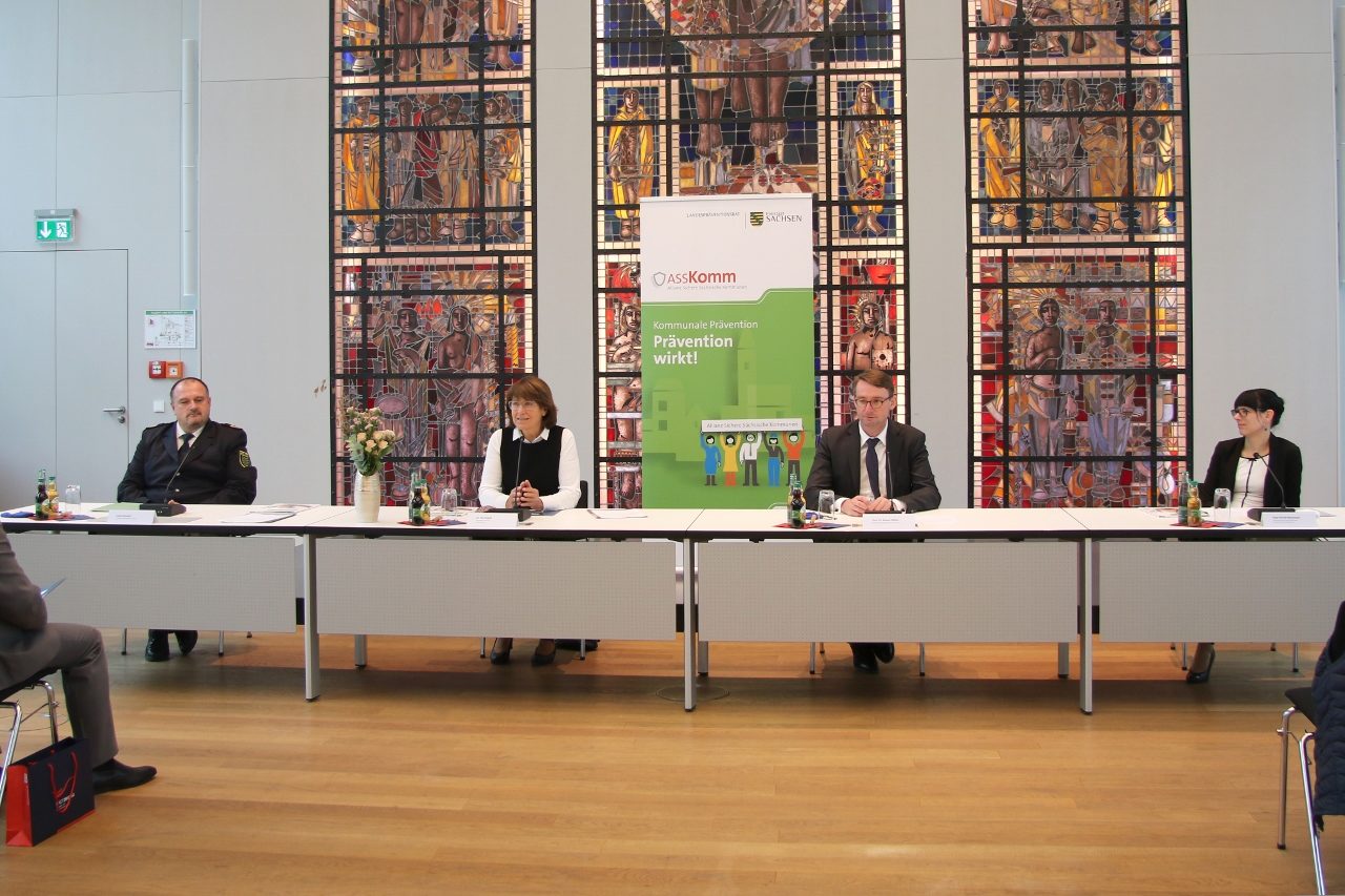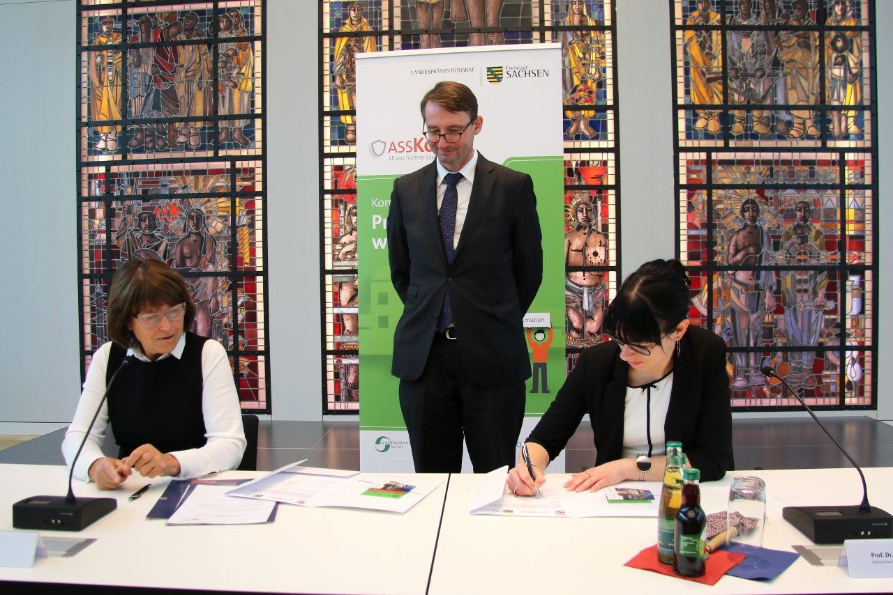 Am heutigen Montag ist im Beisein von Prof. Dr. Roland Wöller, Staatsminister des Innern des Freistaates Sachsen, eine Kooperationsvereinbarung im Rahmen der Allianz Sichere Sächsische Kommunen (ASSKomm) geschlossen worden. Unterzeichnet wurde diese vom Landespräventionsrat (LPR) Sachsen, vertreten durch die stellvertretende Geschäftsführerin des LPR Anja Herold-Beckmann, den Polizeipräsidenten der Polizeidirektion Zwickau René Demmler sowie von Dr. Pia Findeiß, Oberbürgermeisterin der Stadt Zwickau.