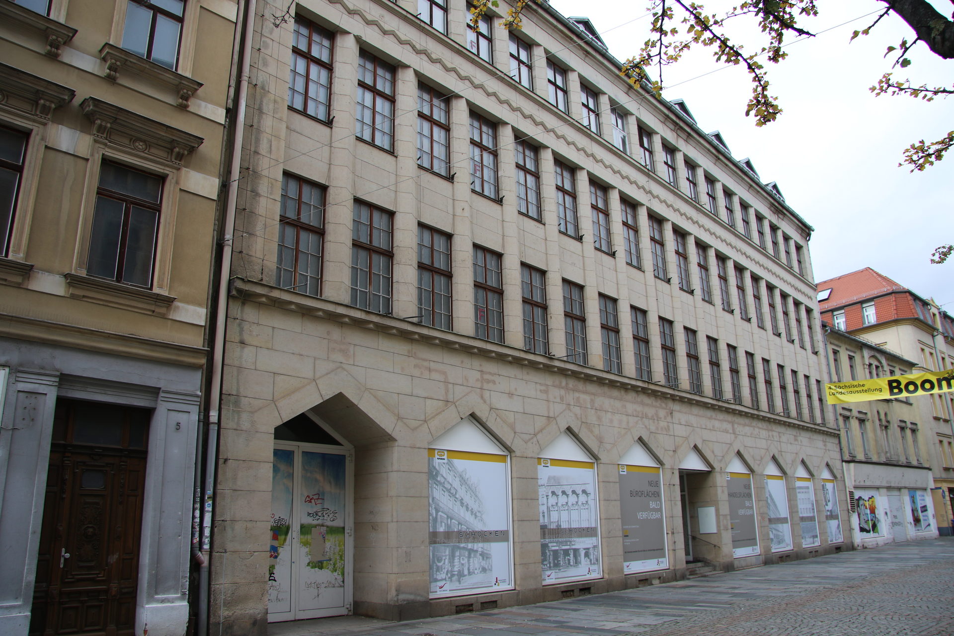 Die mit Folie beklebten Schaufenster des ehemaligen Kaufhauses Schocken kündigen es bereits seit einiger Zeit an: Das Kulturdenkmal im Herzen der Stadt wird saniert, neue Handels- und Büroflächen sollen entstehen. Dass die Wiederbelebung des geschichtsträchtigen Kaufhauses nun in greifbare Nähe rückt, ist dem langjährigen Engagement vieler Beteiligter zu verdanken.
