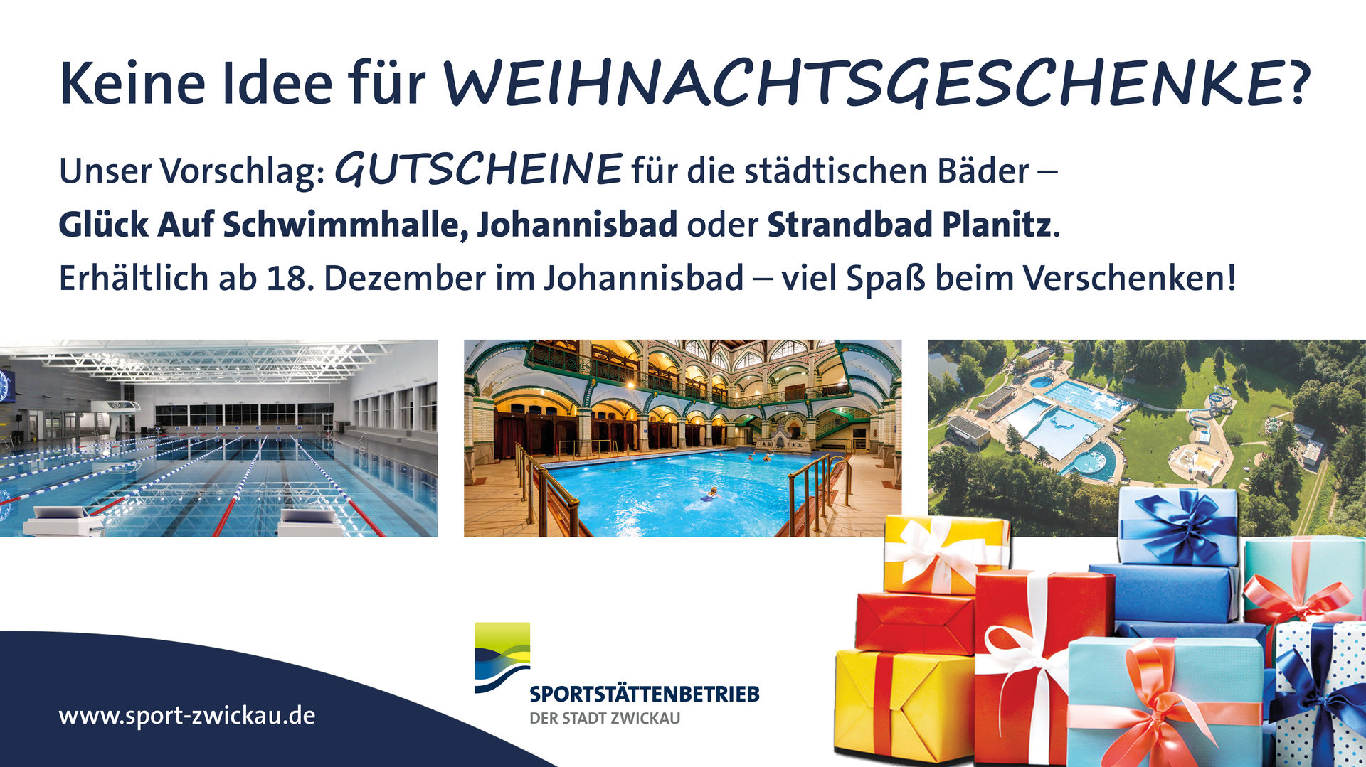 Wer noch auf der Suche nach einem Weihnachtsgeschenk ist, könnte an einen Gutschein für die städtischen Bäder denken. Vom 18. bis 24. Dezember können diese für das Johannisbad und die Glück-Auf-Schwimmhalle erworben werden, erhältlich sind ebenfalls Saison- und 10er Karten für das Strandbad Planitz.