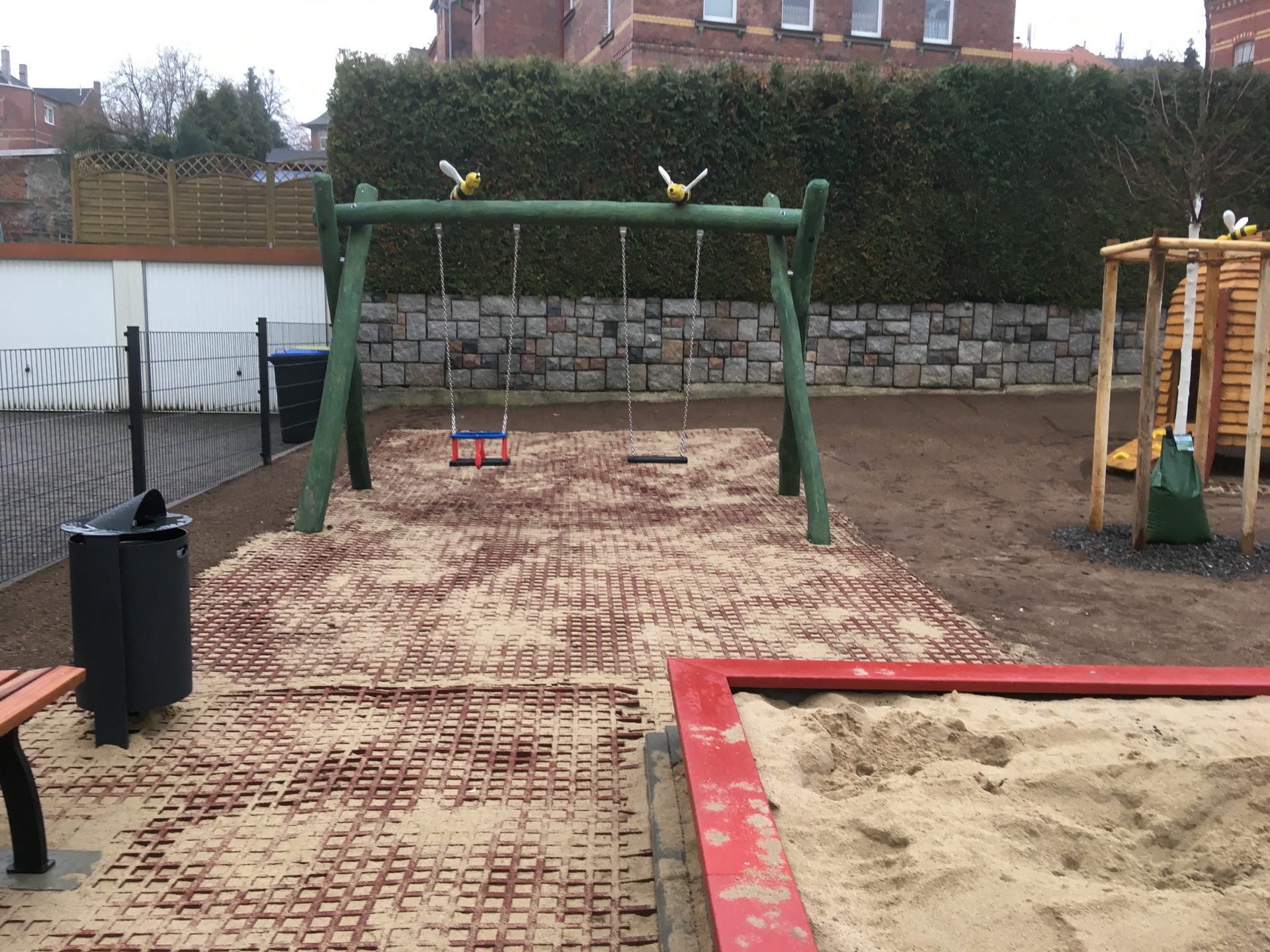 Wenngleich das Bauende bereits am 10. Dezember war, ist der Spielplatz momentan noch verschlossen und wird erst im Frühjahr 2021 nach Bodensetzung und Anwuchs des Rasens bei wärmerer Witterung eröffnet.
