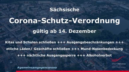 Um die Dynamik der Corona-Pandemie einzudämmen, hat die Sächsische Staatsregierung am Freitag eine weitere Corona-Schutz-Verordnung beschlossen. Sie gilt von Montag (14. Dezember) bis einschließlich 10. Januar 2021. Die Verordnung sieht insbesondere die Schließung von Kitas und Schulen, Ausgangsbeschränkungen sowie eine nächtliche Ausgangssperre vor. Zudem muss ein Großteil der Geschäfte und Läden schließen. Der Alkoholausschank und –konsum in der Öffentlichkeit ist verboten. Die Pflicht zum Tragen einer Mund-Nasen-Bedeckung wird ausgeweitet.