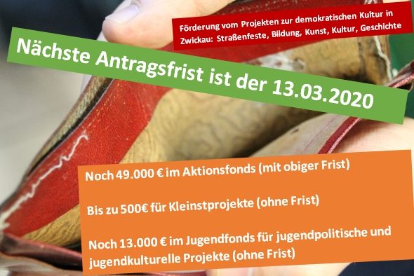 Der Aktionsfonds richtet sich an Vereine. Hier stehen nach Angaben der Koordinierungsstelle 49.000 Euro zur Verfügung, die nächste Antragsfrist ist der 13. März 2020. Die Projekte sollen sich der Verbesserung der demokratischen Kultur in Zwickau widmen und noch im Jahr 2020 umgesetzt werden.