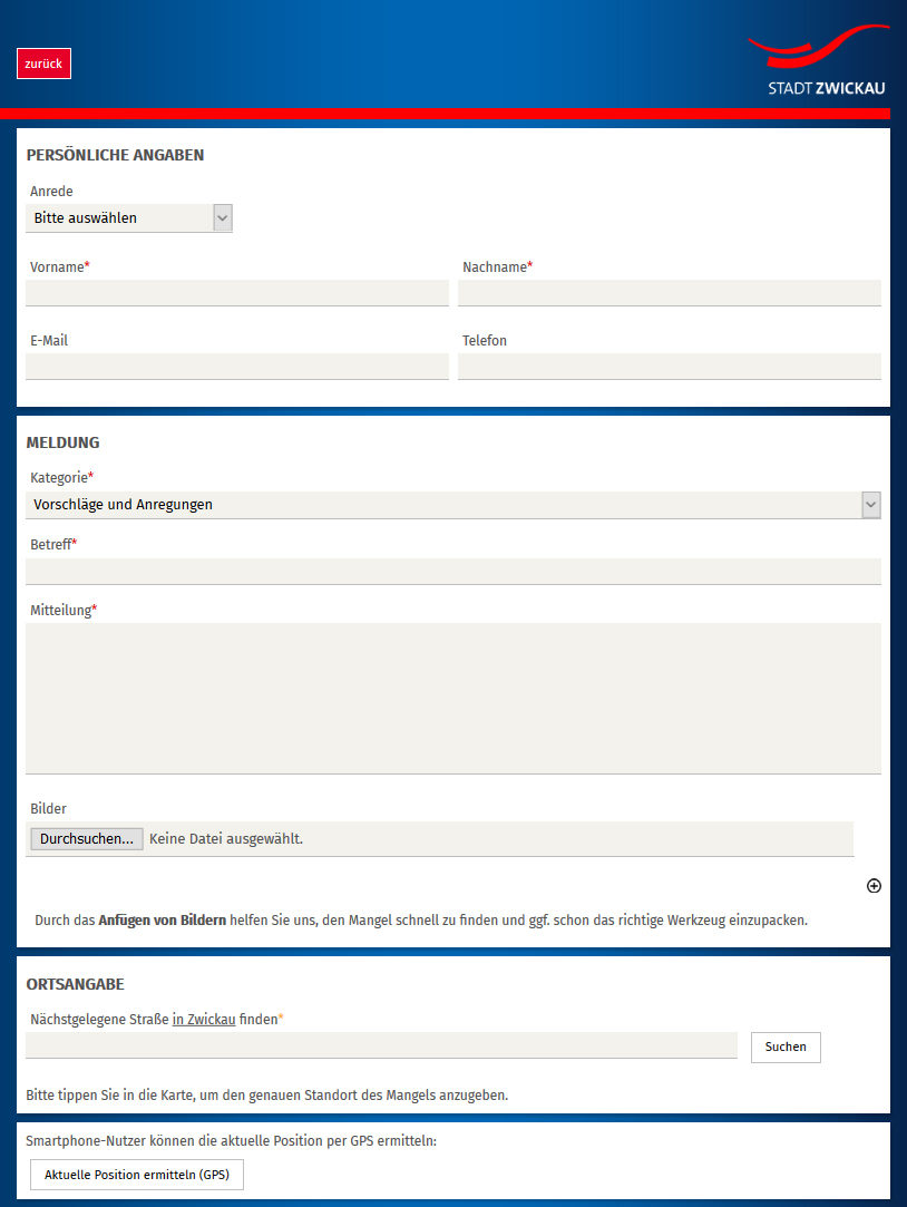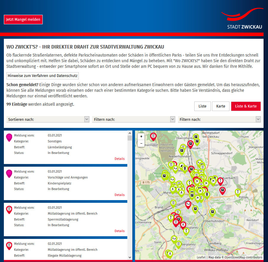 Im städtischen Portal „Wo Zwickt’s?“ stehen von heute an zwei neue Kategorien zur Verfügung. Bürgerinnen und Bürger können nun nicht nur Schäden oder andere Mängel melden. Unter „Vorschläge und Anregungen“ besteht ab sofort die Möglichkeit, Ideen zu übermitteln. Ebenfalls neu ist der Bereich „Sonstiges“. Hier können Probleme beschrieben werden, die keiner der anderen Kategorien zugeordnet werden können.