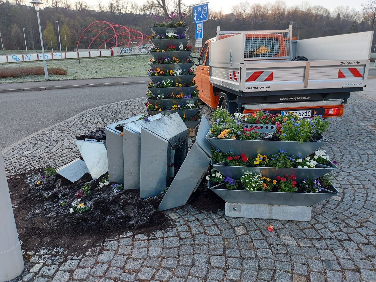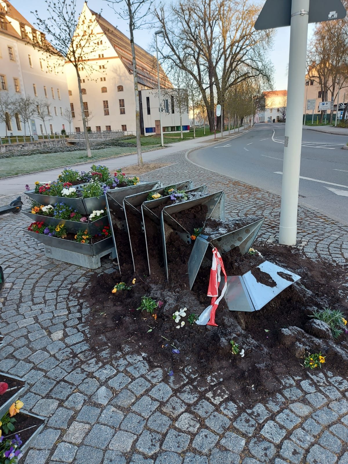 Bereits zum dritten Mal innerhalb eines Monats wurde in der Nacht vom 23. zum 24. April eine Pflanzpyramide am Schloss Osterstein sehr stark beschädigt. Dabei wurden nicht nur die Pflanzen in Mitleidenschaft gezogen. Auch das Gerüst der Blumenampel ist nahezu unbrauchbar und muss mit hohem Aufwand wiederhergestellt werden. Der Gesamtschaden der drei bei der Polizei angezeigten Vorgänge beläuft sich insgesamt auf über 2.000 Euro.