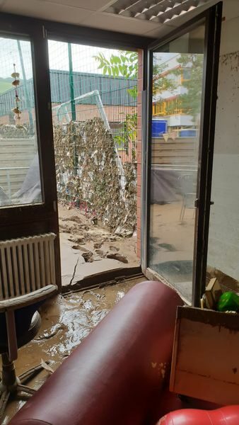 Besonders schwer betroffen ist u. a. auch die Integrative Kita St. Hildegard, eine Kita des Caritasverbandes Rhein- Mosel-Ahr e. V., in der bis zu 54 Kinder, z. T. auch in heilpädagogischen Gruppen, betreut werden. Die Kita als solche gibt es nicht mehr. Was zurückblieb, ist ein Ort der Verwüstung. Die Flutmassen drangen auch in und durch das Gebäude, rissen Möbel, Therapiematerialien, Spielsachen und somit auch Erinnerungen und Liebgewonnenes mit sich und verwandelten es binnen kurzer Zeit in eine seelenlose Brache. Auch der Außenbereich ist nicht wiederzuerkennen und gleicht einer verschlammten Müllhalde. Noch weiß niemand, wie es weiter gehen soll.