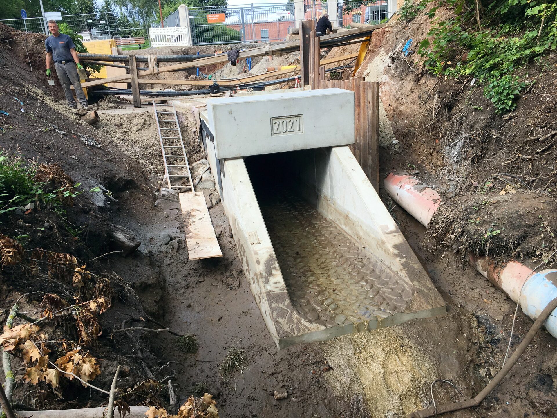 Nach der kompletten Fertigstellung des Durchlasses wird der vorhandene Abwasserkanal aus Richtung Kurt-Eisner-Straße in Richtung Wolfsgraben erneuert und parallel dazu die neue Trinkwasserleitung eingebaut. Im Abschnitt zwischen August Horch Museum und Durchlass Wolfsgraben werden aktuell verschiedene Medienleitungen verlegt.