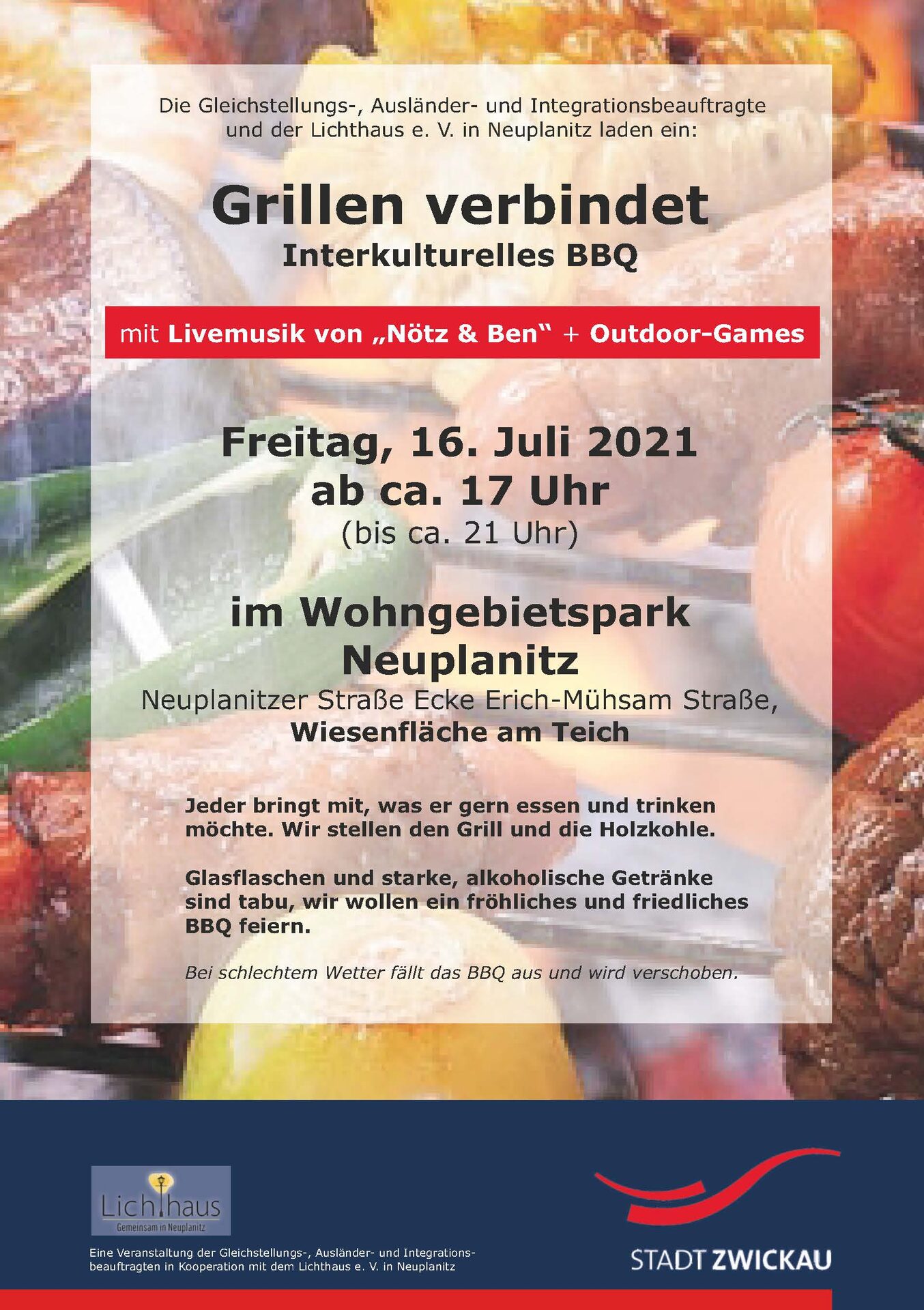 „Grillen verbindet“ ist eine Veranstaltung der Gleichstellungs-, Ausländer- und Integrationsbeauftragten der Stadt Zwickau im Rahmen des Projektes „Kochen verbindet“. Das interkulturelle BBQ findet jährlich an wechselnden Orten und mit verschiedenen Kooperationspartnern statt. Den Grillabend in Neuplanitz unterstützt der dort ansässige Lichthaus e. V.