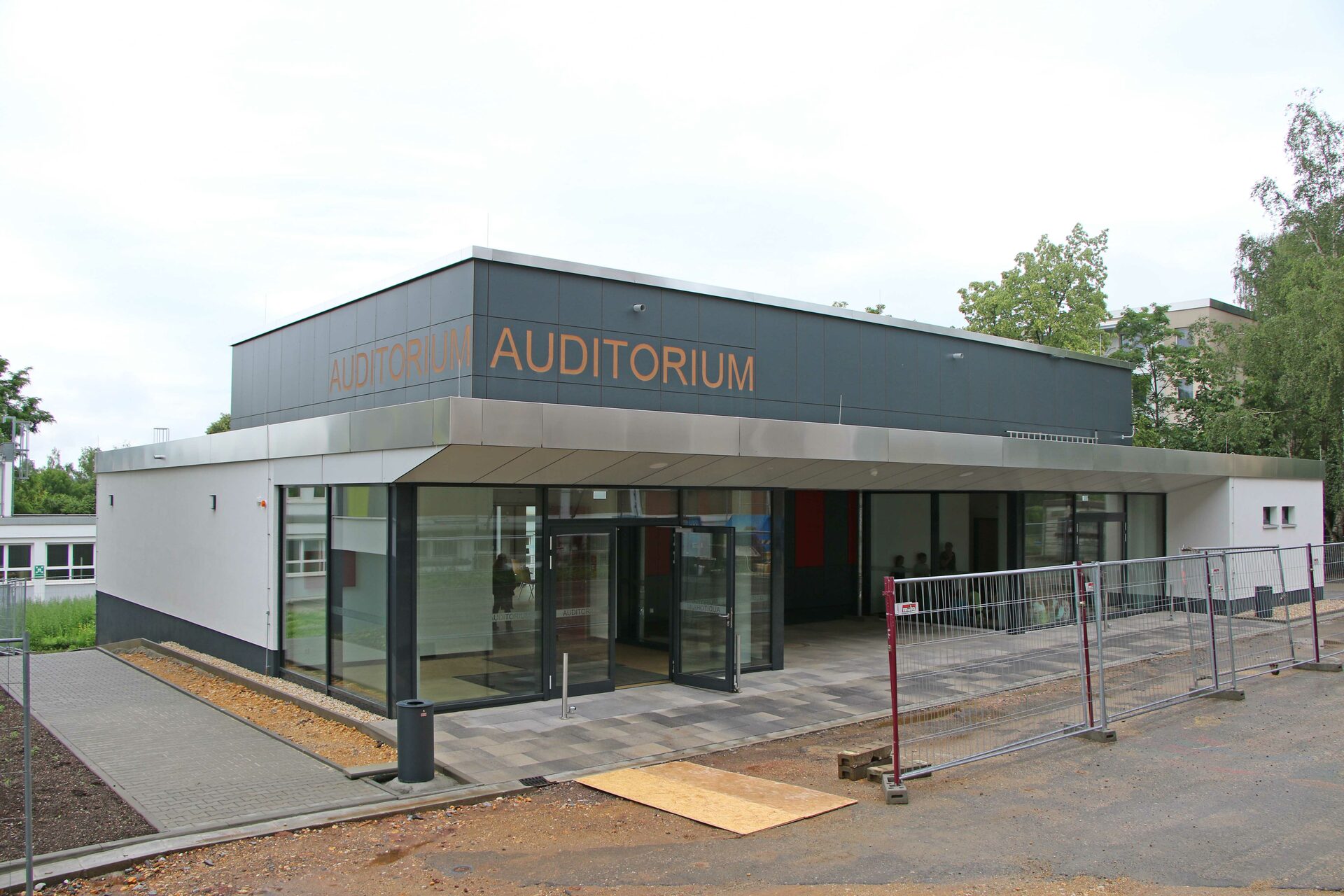 Das eingeschossige Auditorium wurde von März 2020 bis März 2021 als Neubau errichtet. Gestalterisch hat man sich am Erscheinungsbild der Schulen orientiert. Daran schloss sich die Gestaltung der Außenanlagen an. An dem Projekt waren insgesamt 19 Planer und Baufirmen beteiligt. Die Federführung hatte das städtische Liegenschafts- und Hochbauamt.