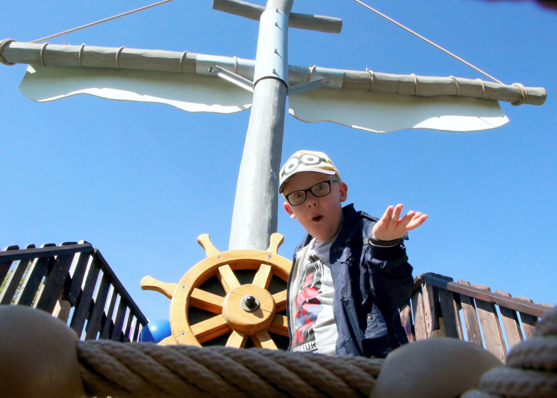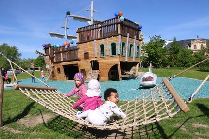 Auf dem 8 Meter langen Holzsteg kann man nicht nur die Beine baumeln lassen, sondern blickt auf 200 Quadratmeter „Meer“. Blaue Holzhackschnitzel bieten ausreichend Schutz, sollte ein kleiner Pirat beim Entern mal ins Wasser fallen. Das Herzstück der 600 Quadratmeter großen Spielanlage bildet das Piratenschiff. Auf dem 11 Meter langen und 7 Meter hohen Spielgerät kann man sich herrlich austoben. Auch im Inneren des Seglers gibt es viel zu erkunden. Wer sich am Haifisch vorbei traut, kann über eine Öffnung gleich in den Rumpf gelangen. Wer als „Landratte“ zum Piratenschiff gelangen will, muss noch nicht einmal schwimmen können. Über einen gepflasterten Weg kommt man direkt aufs Deck und kann dort das Steuer übernehmen und die Segel setzen lassen. Doch aufgepasst – ist überhaupt schon in der Kombüse alles für das Picknick vorbereitet?