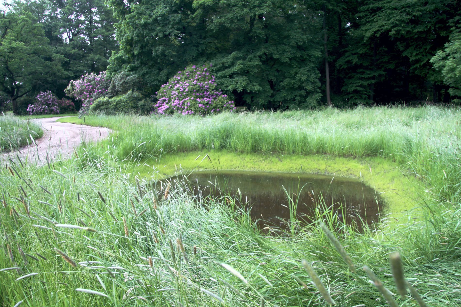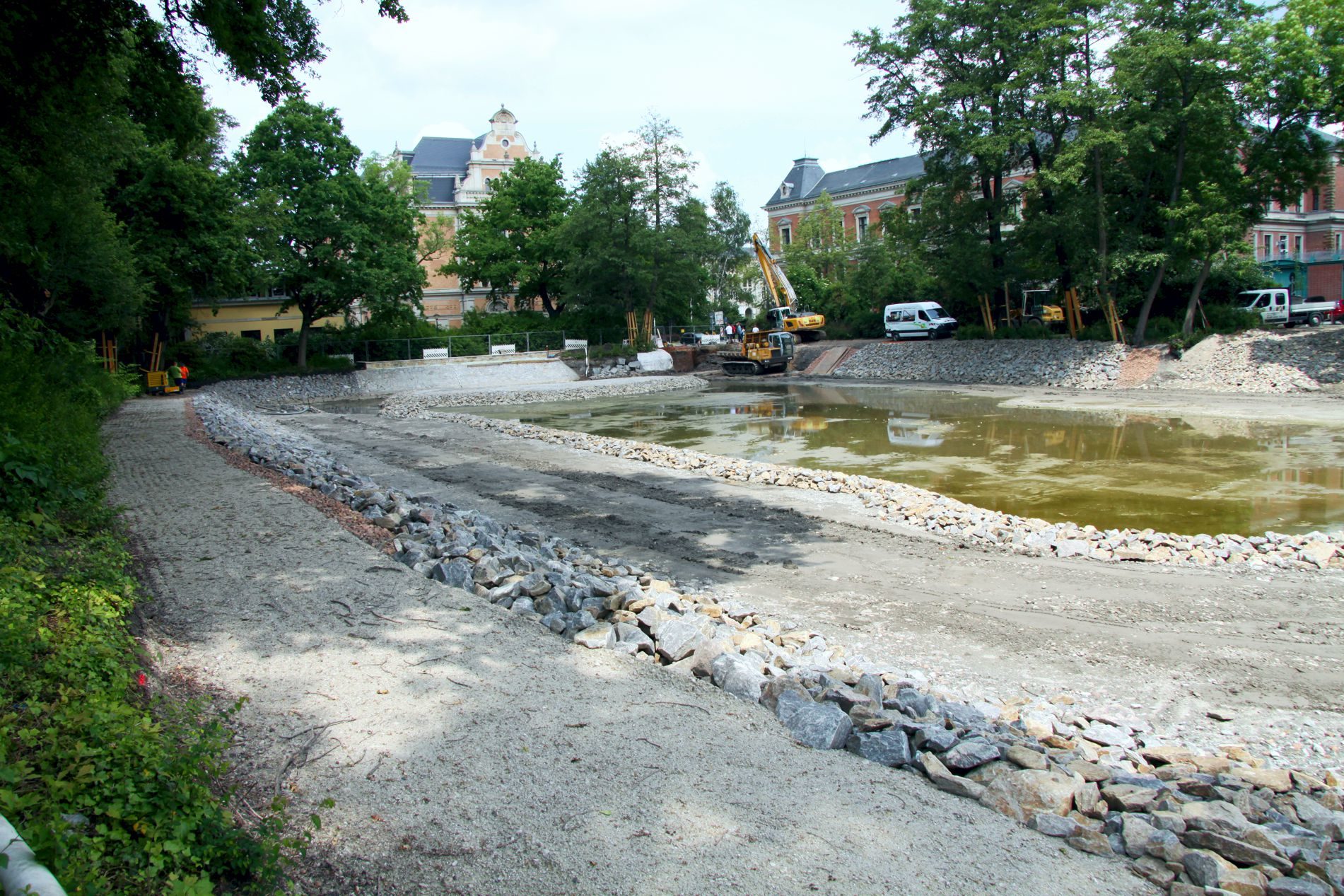 Besonders ins Auge fällt aktuell die Sanierung des Langen Teichs im östlichen Bereich der Parkanlage. Hier konnten nach der Entwässerung im März und dem anschließenden Abfischen ca. ein halber Meter Schlamm beseitigt und der Teichboden neu modelliert werden. Im nördlichen Teich, nahe der Terrasse, ist er nun mit knapp 2 Metern am tiefsten. Damit hat er nicht nur an Volumen gewonnen, sondern sorgt zukünftig auch für eine optimale Gewässerkühlung. Südlich wurde er recht flach gehalten und bietet der Pflanzenwelt, den Amphibien und Insekten somit ideale Bedingungen.