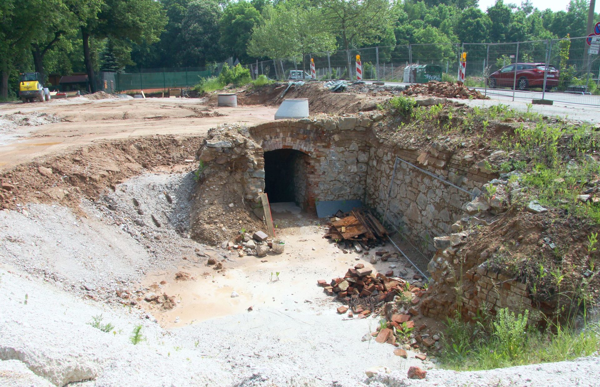 Ein Teilbereich der Terrassenfläche an der Parkstraße ist noch gesperrt. Hier wird noch im Bereich zweier Baugruben gearbeitet. In einer befindet sich ein alter Zugang zum Kellergewölbe. In diesem muss der Kellerfußboden noch so hergerichtet werden, dass anfallendes Sicker-/Quellwasser gesammelt und über einen Schacht zum Ablauf in Richtung Schwanenteich geleitet wird.