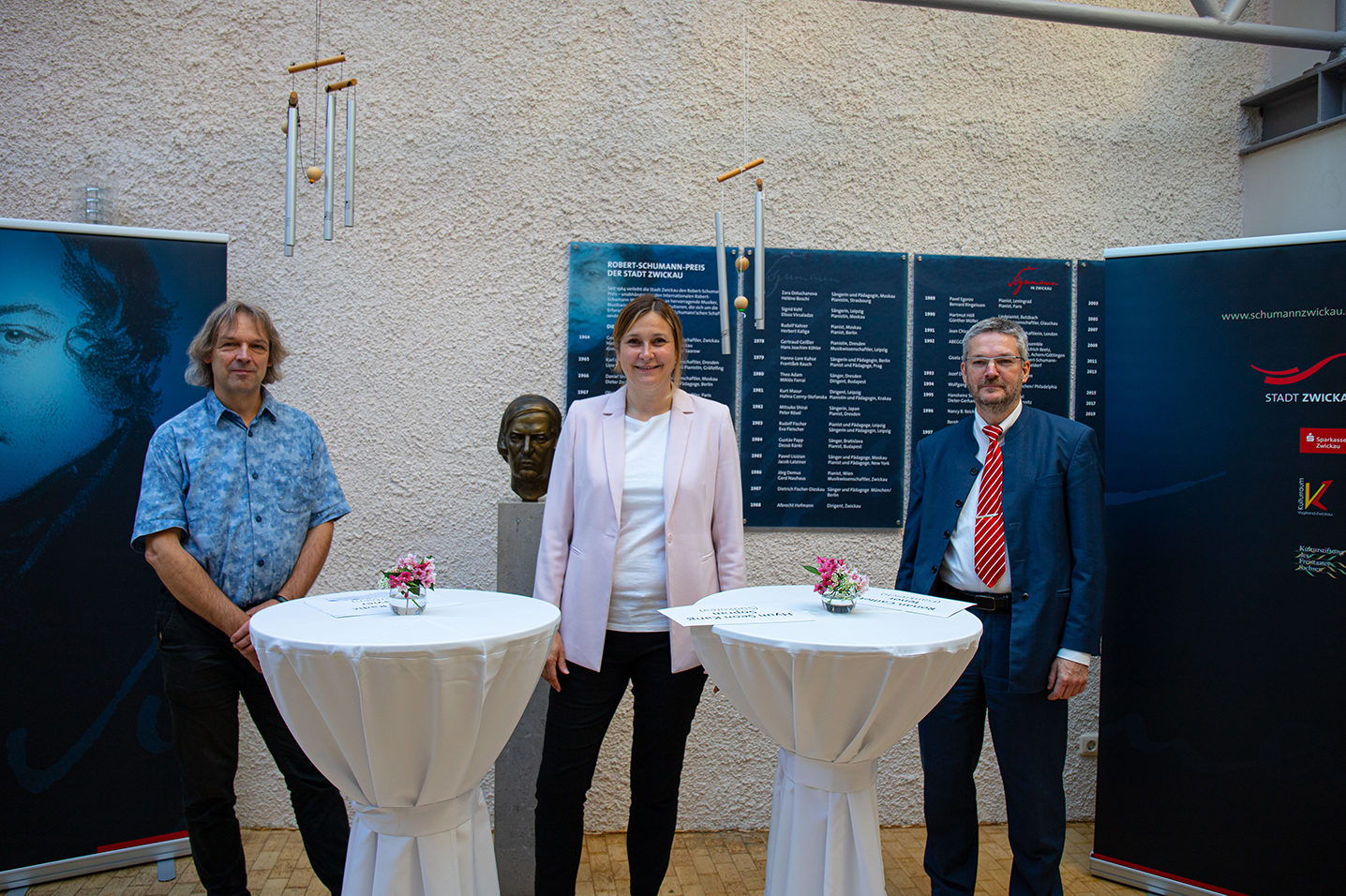 Der Leiter des Robert-Schumann-Hauses und Vorsitzender der Wettbewerbsjury, Dr. Thomas Synofzik, Oberbürgermeisterin Constance Arndt und Felix Angermann, Vorstandsvorsitzender der Sparkasse Zwickau verkündeten die Preisträger des Video-Wettbewerbes.