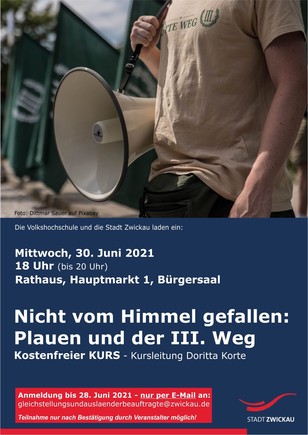 Am Mittwoch, 30. Juni 2021, 18 Uhr laden die Volkshochschule und die Stadt Zwickau zur gemeinsamen kostenfreien (Kurs-)Veranstaltung „Nicht vom Himmel gefallen: Plauen und der III. Weg“ in den Bürgersaal im Rathaus, Hauptmarkt 1 ein. Moderiert wird die Veranstaltung zum Thema rechtsextremer Strukturen und Bewegungen in Sachsen, die bis ca. 20 Uhr geplant ist, von Doritta Korte (Volkshochschule).