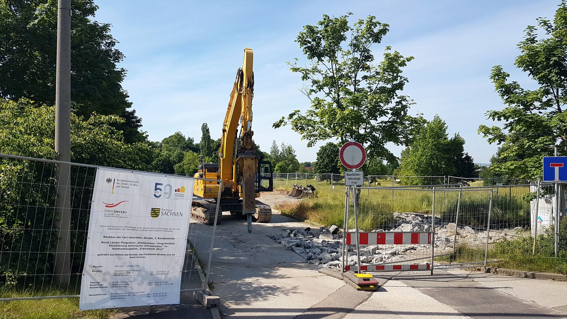 Mit dem 3. Bauabschnitt zum Rückbau der Carl-Goerdeler-Straße wird vorerst die letzte Infrastrukturbaumaßnahme südlich der Sternenstraße umgesetzt. Auf einer Länge von ca. 75 m wird die Betondecke der Fahrbahn und der ehemaligen Stellplätze abgebrochen. Zur Entstehungszeit des Wohngebietes wurde einst „Wismutschotter“ aus Crossen als Straßenunterbau verwendet. Das Material ist radiologisch belastet, ca. 1.000 Tonnen müssen aufwendig ausgehoben und auf einer Halde in Großpösna bei Leipzig entsorgt werden. Im Anschluss daran erfolgt die radiologische Freimessung und die Wiederverfüllung der Fläche.