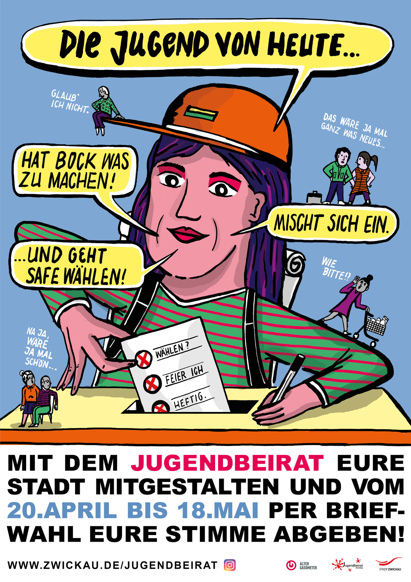 Die Wahl des Jugendbeirats findet in diesem Jahr ausschließlich als Briefwahl statt. Mitte April erhielten die fast 7.000 wahlberechtigten Zwickauerinnen und Zwickauer die erforderlichen Unterlagen. Den grünen Wahlbrief können die Jugendlichen und jungen Erwachsenen kostenlos in jeden Briefkasten der Deutschen Post einwerfen. Ebenso kann er in einen der Briefkästen der Stadtverwaltung am Haupteingang des Rathauses oder vor dem Verwaltungszentrum an der Werdauer Straße 62 gesteckt werden. Wichtig ist, dass die Unterlagen spätestens am 18. Mai um 18 Uhr im Briefwahlbüro vorliegen sind. Etwaige Beförderungszeiten sind von den Wählerinnen und Wählern zu beachten.