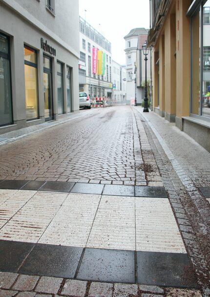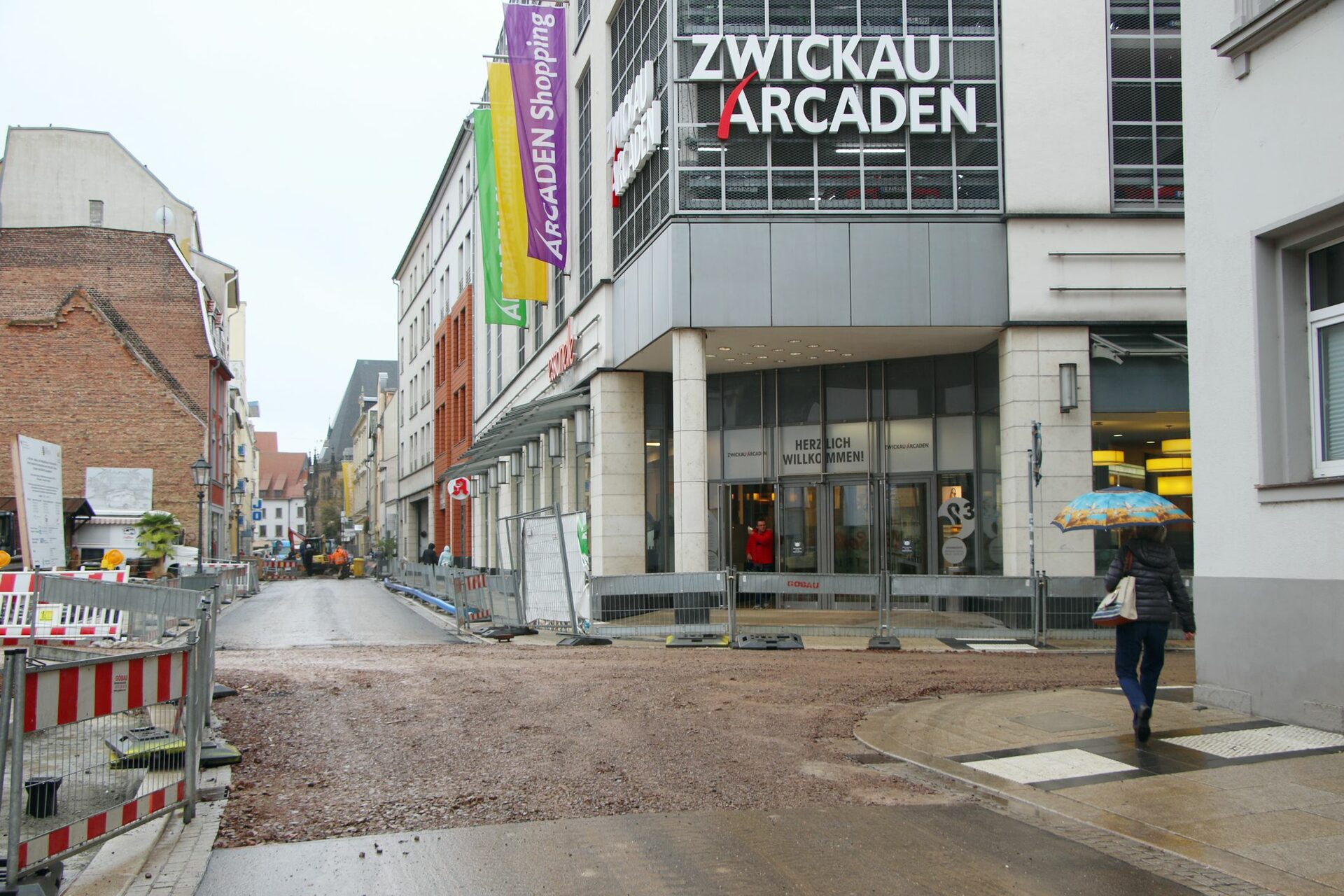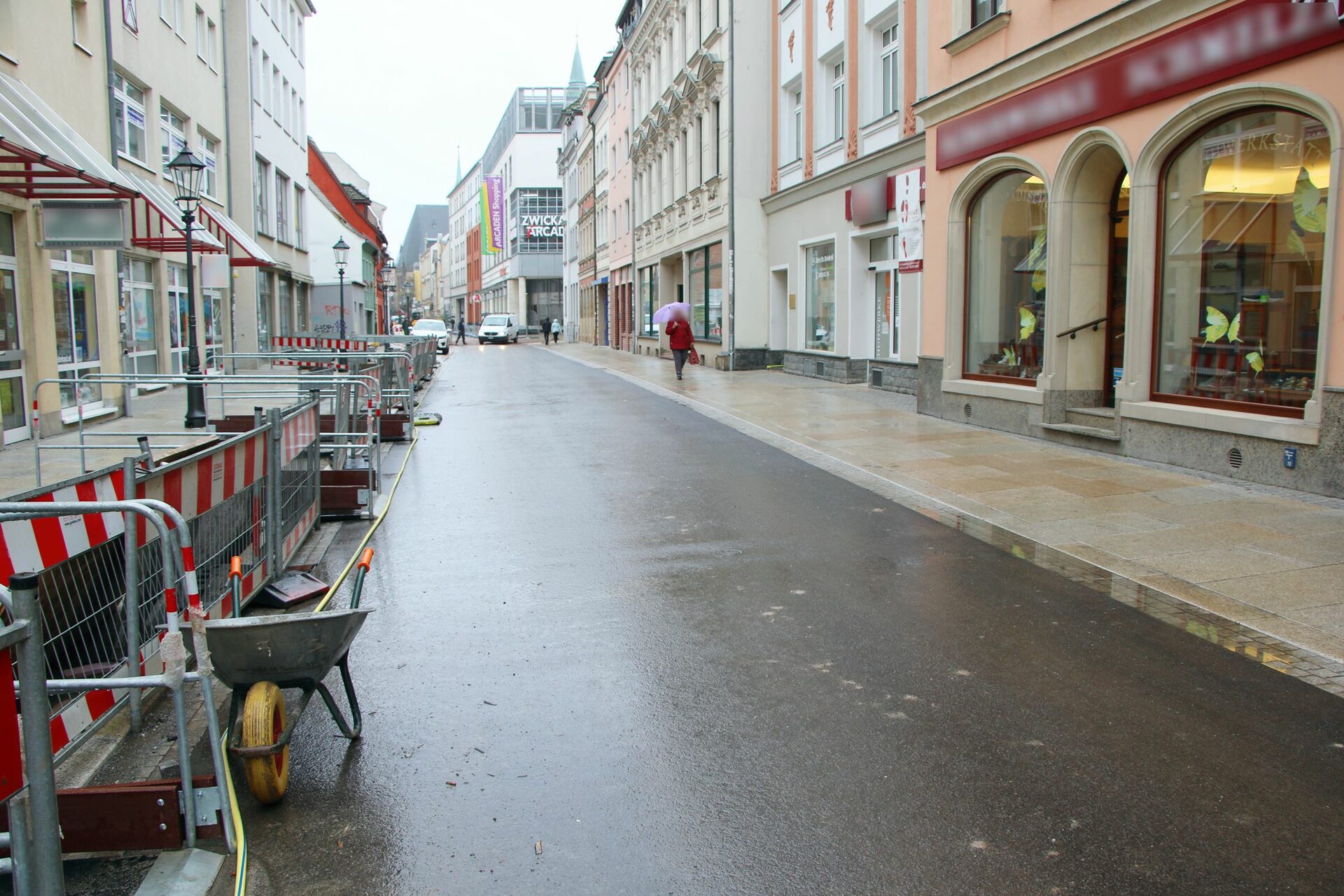 Nachdem in der vergangenen Woche in der Marienstraße (Abschnitt zw. Schumannplatz bis Lieferzufahrt Zwickau-Arcaden) der Asphalt eingebaut wurde, konnte jetzt auch das Rosengäßchen fertiggestellt und für den Fußgängerverkehr freigegeben werden. Hier erfolgte auf der gesamten Länge der Einbau von gestocktem Granitkleinpflaster. Dieses weist eine sehr ebene Oberfläche auf und kann somit auch von Menschen mit Mobilitätseinschränkungen sehr gut begangen werden. Beidseitig angelegte Entwässerungsrinnen sorgen nun für eine optimale Oberflächenentwässerung.