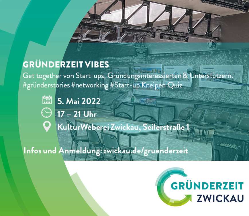 Zu GRÜNDERZEIT Vibes am Donnerstag, dem 5. Mai 2022 in der KulturWeberei Zwickau stellen sich ab 17 Uhr fünf regionale Gründerinnen und Gründer vor. Sie berichten von ihren Erfahrungen auf dem Weg zur Selbstständigkeit, welche Herausforderungen sie durchleben mussten, aber auch welche Erfolge es zu feiern gab. Jeder hat fünf Minuten Zeit, um sein Unternehmen vorzustellen. Danach findet gemeinsam mit dem Publikum eine Fragerunde auf der Bühne statt. Durch den Mix von jungen Gründern, Nachfolgeunternehmern und kleinen Firmen, die bereits länger auf dem Markt sind, wird das Thema Gründung aus verschiedenen Sichtweisen beleuchtet.