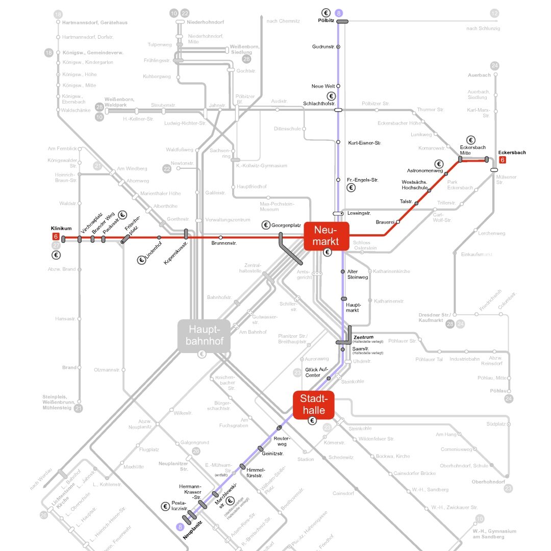Den Angaben zufolge verkehrt lediglich eine Straßenbahnlinie zwischen Eckersbach und Klinikum. Zwischen Pölbitz und Neuplanitz erfolgt Schienenersatzverkehr. Für die Haltestellen "Zentrum", "Saarstraße" und "Marchlewskistraße (stadtauswärts)" werden Ersatzhaltestellen eingerichtet. Die Haltestelle "Erich-Mühsam-Straße" wird während des angegebenen Zeitraums nicht bedient. Durch den Umleitungsfahrplan werden, wie die SVZ informieren, zusätzlich die Haltestellen "Wilhelm-Stolle-Platz" durch die Busse angefahren. Hauptumsteigepunkt bleibt der Neumarkt.