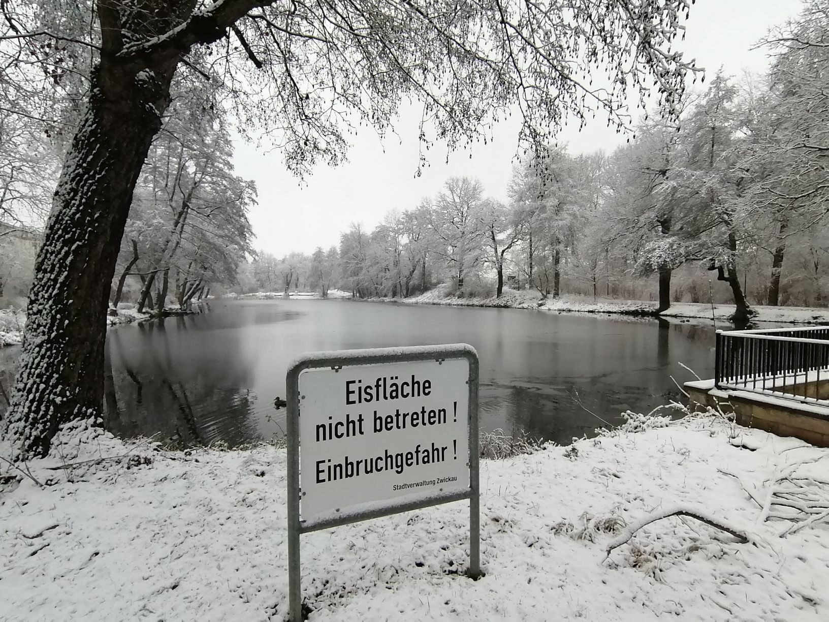 Die winterlichen Temperaturen lassen auch die Zwickauer Teiche und Bachläufe gefrieren. Ein Betreten der Eisflächen ist aufgrund der fehlenden Tragfähigkeit jedoch unbedingt zu unterlassen. Besonders Kinder gehen gerne aufs Eis und sind durch die Eltern auf diese Gefahren hinzuweisen.
