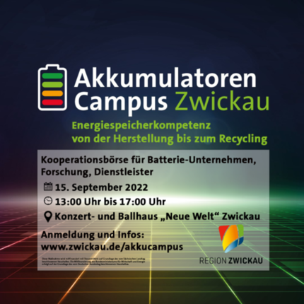 Unter dem Titel „AkkumulatorenCampus Zwickau“ haben die Partner der Region Zwickau ein Netzwerk etabliert. Dieses richtet sich an regionale Hersteller ebenso wie an Anwender neuer Batterietechnologien sowie die dazugehörige Forschung und Entwicklung. Ganz bewusst geht es dabei nicht nur um Fahrzeugbatterien und E-Mobilität, sondern um die ganze Palette der Energiespeichersysteme. Das Netzwerk soll die regionalen Kompetenzen sichtbar machen und die Weiterentwicklung und Stärkung dieser Branche unterstützen. Bisher haben Netzwerktreffen für Austausch und Synergieeffekte gesorgt.