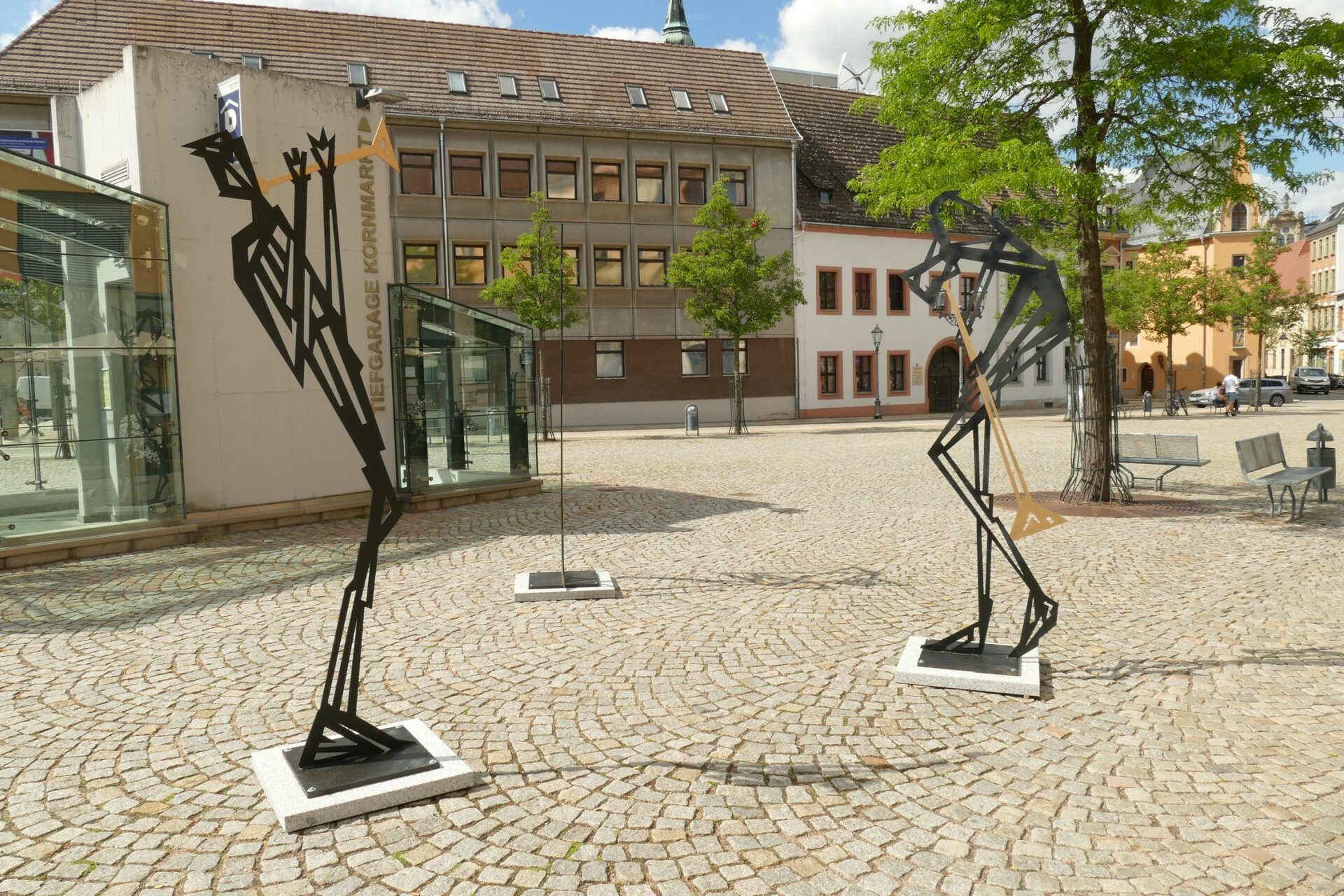 Zum dritten Mal in Folge hat sich in diesem Sommer der Kornmarkt in eine Outdoor-Galerie verwandelt. Hotelchefin Anett Strobel hat erneut den aus dem Landkreis Zwickau stammenden Künstler Tilmann Röhner für das Projekt gewinnen können. Vor zwei Jahren sorgte er bereits mitten in der Pandemie mit seinen goldenen Wellen für einen Hauch von Urlaubstimmung. Dieses Jahr können Kunstfreunde bis 12. August neben den drei großen Skulpturen noch weitere acht kleinere Musiker-Figuren im Foyer und im Frühstücksraum des Hotels besichtigen. Das Projekt wird unterstützt vom Büro für Wirtschaftsförderung und soll einen Beitrag zur Belebung des Kornmarktes leisten.