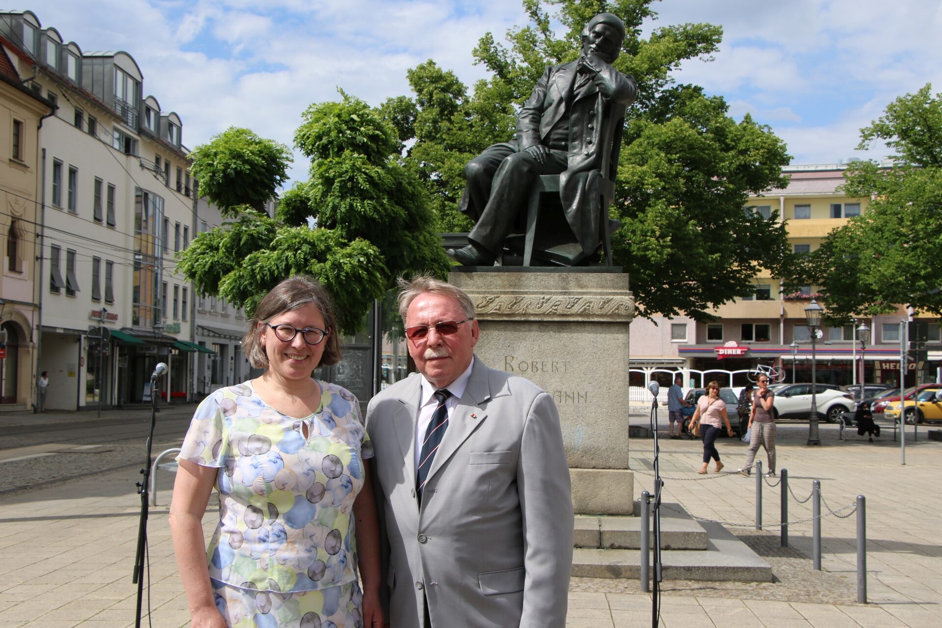 Katrin Synofzik und Rainer Eichhorn vor dem Robert-Schumann-Denkmal.