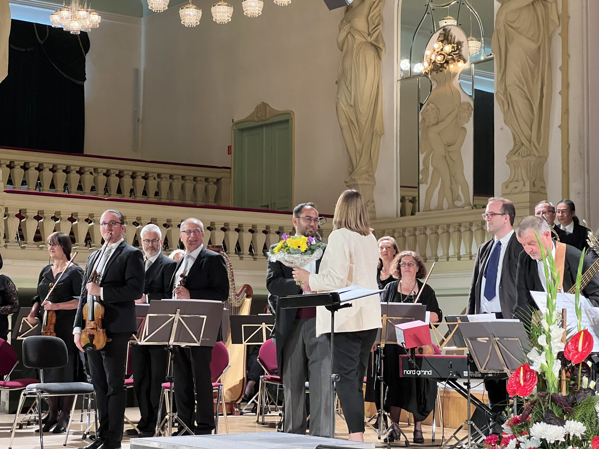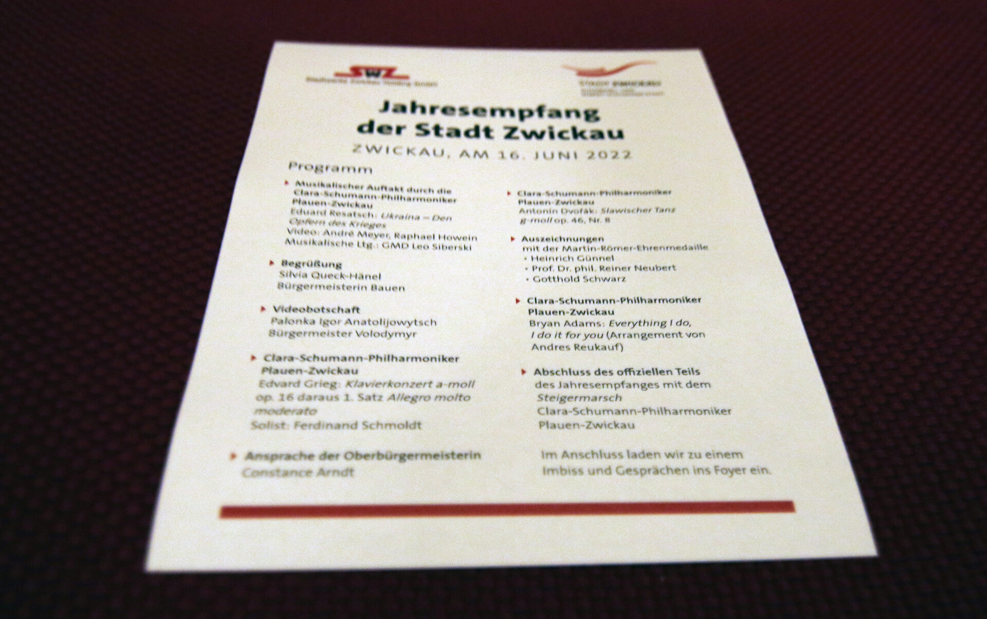 Die stimmungsvolle musikalische Begleitung des offiziellen Festaktes übernahmen die Clara-Schumann-Philharmoniker Plauen-Zwickau unter Leitung von GMD Leo Siberski. Der Auftakt war den Menschen in der Ukraine gewidmet, die seit vielen Wochen einen grausamen Krieg erdulden. Von Eduard Resatsch erklang „UKRAINA – den Opfern des Krieges“. Auf einer Leinwand war dazu ein Video von André Meyer und Raphael Howein zu sehen. Derzeit spielen viele Orchester das Stück zu Beginn ihrer Auftritte, um ein unüberhörbares Zeichen zu setzen und mit Mitteln der Musik das sofortige Ende des Krieges zu fordern. Der gebürtige Ukrainer Resatsch komponierte unmittelbar nach Kriegsausbruch das viereinhalbminütige Werk im Gedenken an die Menschen, die unter dem Krieg in der Ukraine leiden und setzt sich mit den Geschehnissen in seiner Heimat auseinander. Der etablierte Komponist, dessen Familie in der Ukraine lebt, spielt bei den Bamberger Symphonikern.