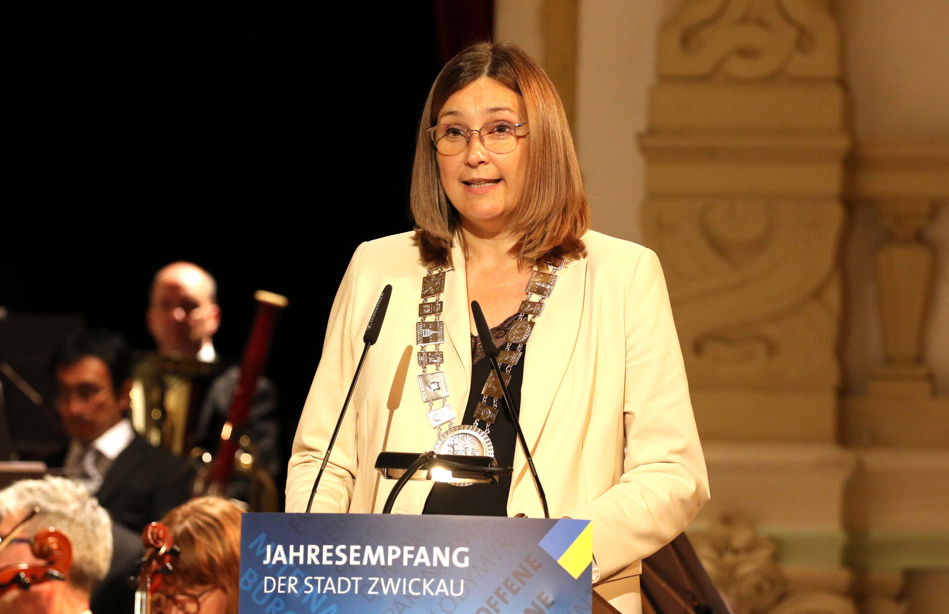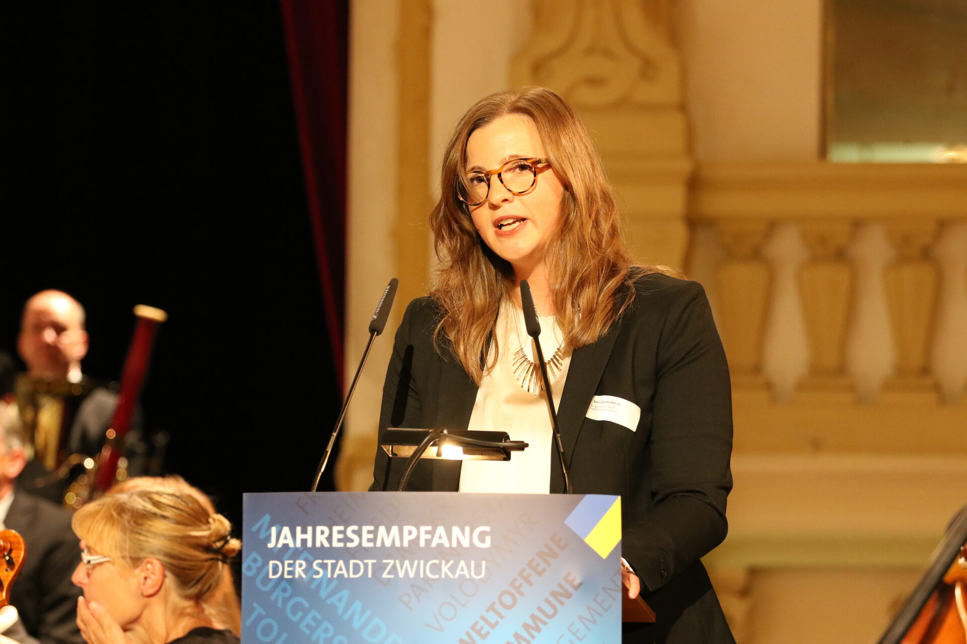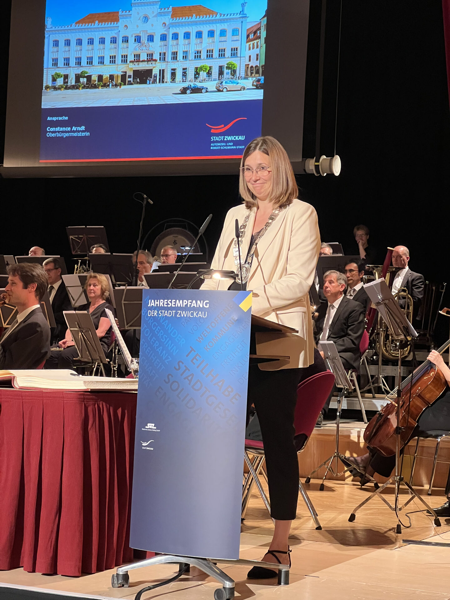 Wenngleich ihre Amtseinführung bereits am 17. November 2020 auf der Bühne in der „Neuen Welt“ stattfand, konnte Oberbürgermeisterin Constance Arndt erst jetzt an gleicher Stelle ihre erste Ansprache im Rahmen des traditionellen offiziellen Jahresereignisses halten. Angesichts des kaum enden wollenden Krisenmodus durch die Corona-Pandemie und den fürchterlichen Krieg, der einem Land und seinen Bewohnern unvorstellbares Leid beschere, täte es gut, sich zu treffen, Verbindendes zu finden: „Wir werden gefordert sein! Wir brauchen mehr denn je Agilität und Mut, die neuen Umstände anzunehmen und das Schicksal in die eigene Hand zu nehmen.“ Wichtig dabei sei, weiterhin Zeichen für ein weltoffenes und tolerantes Zwickau zu setzen, zu zeigen, dass Zwickau bunt ist und bleiben soll.