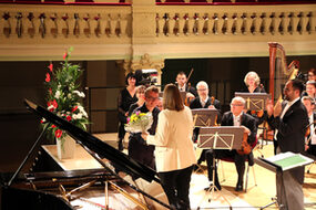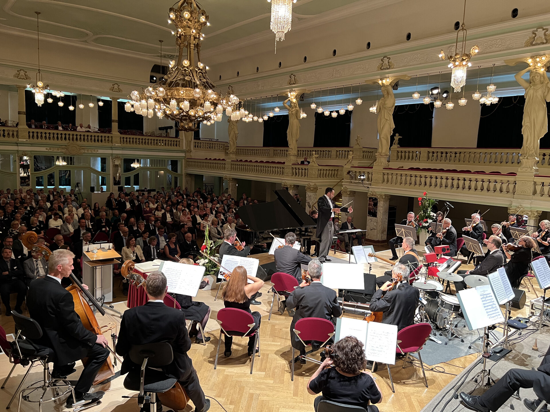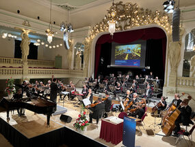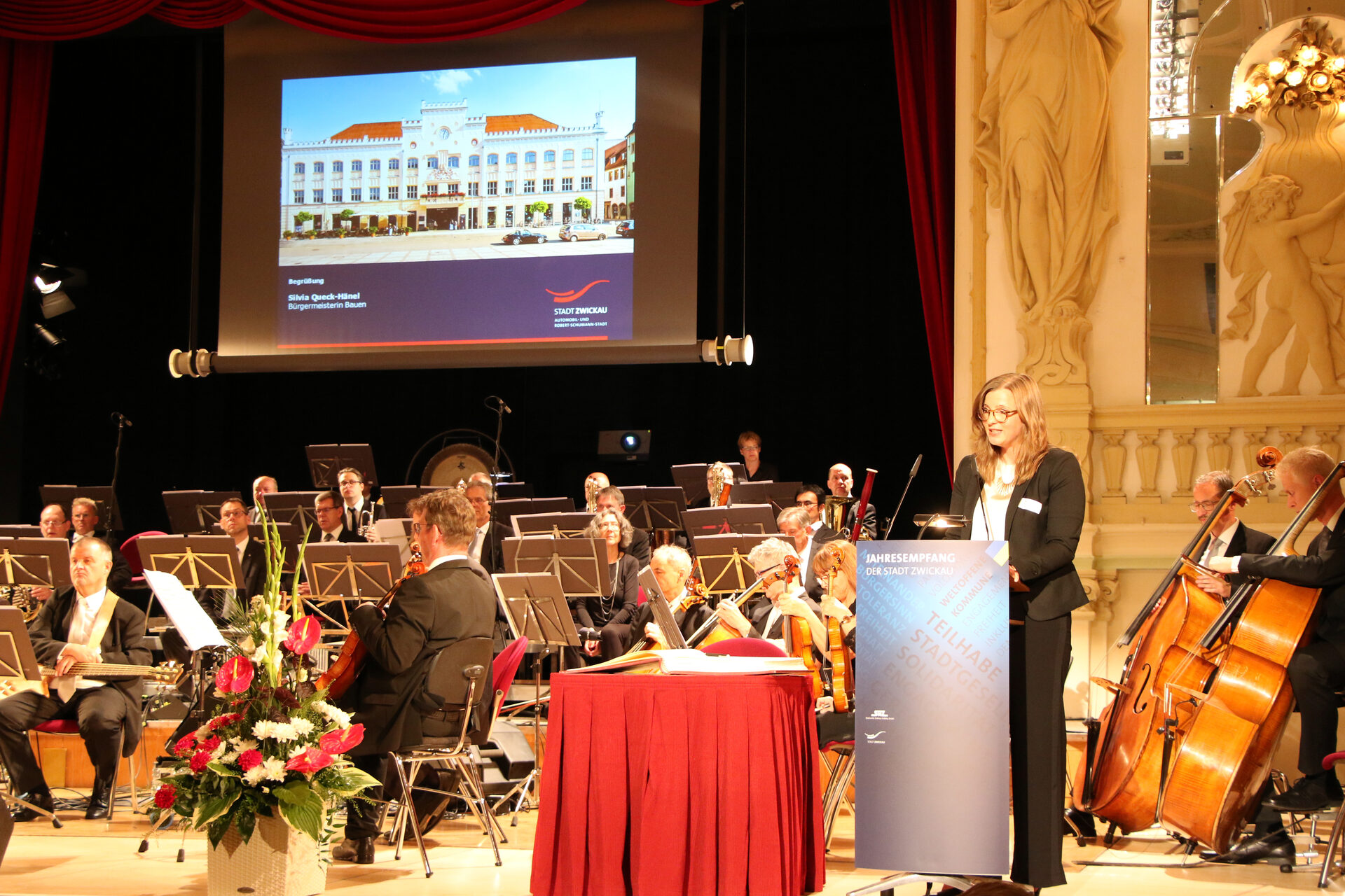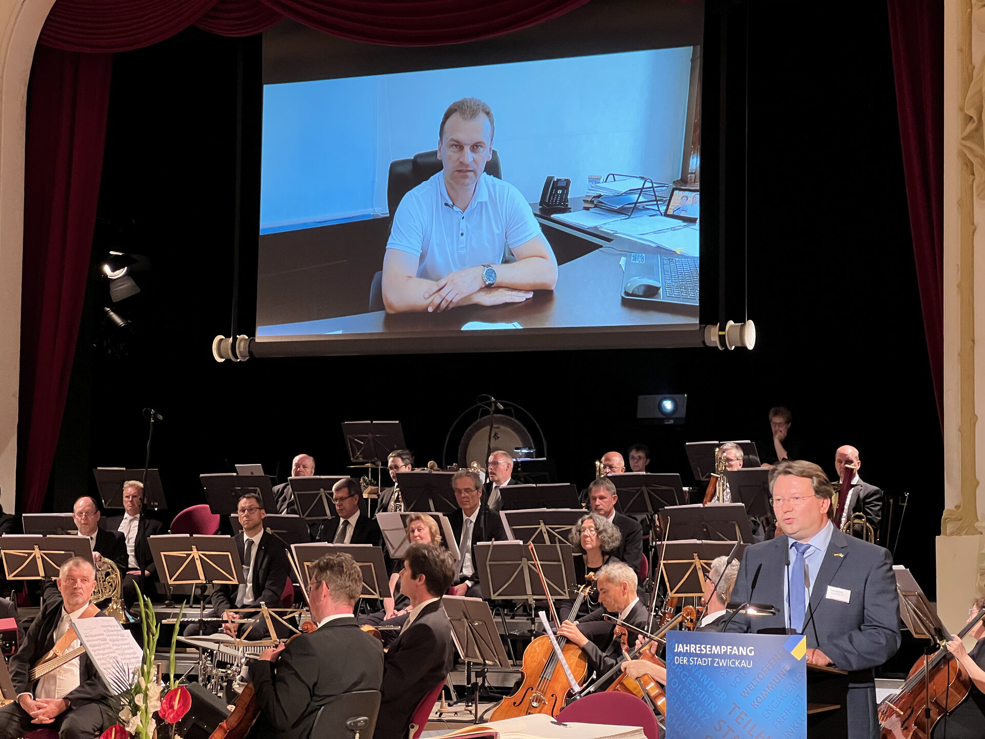 Nach dieser besonderen Aufführung begrüßte Bürgermeisterin Silvia Queck-Hänel im Namen des Aufsichtsrates der Stadtwerke Zwickau Holding GmbH die Gäste des Neujahrsempfangs 2022. Im Anschluss daran wandte sich der Bürgermeister der ukrainischen Partnerstadt Volodymyr, Palonka Igor Anatolijowytsch mit einer Videobotschaft an die Gäste des Jahresempfangs. Es folgte eine Aufführung aus Edvard Griegs Klavierkonzert a-moll op. 16 den 1. Satz Allegro molto moderato. Gemeinsam mit den Clara-Schumann-Philharmonikern Plauen-Zwickau trat der Pianist Ferdinand Schmoldt als Solist auf. Der junge Musiker besucht derzeit noch die Förderklasse Klavier im Robert Schumann Konservatorium und erhielt beim Kleinen Schumann Wettbewerb 2018 einen Förderpreis.