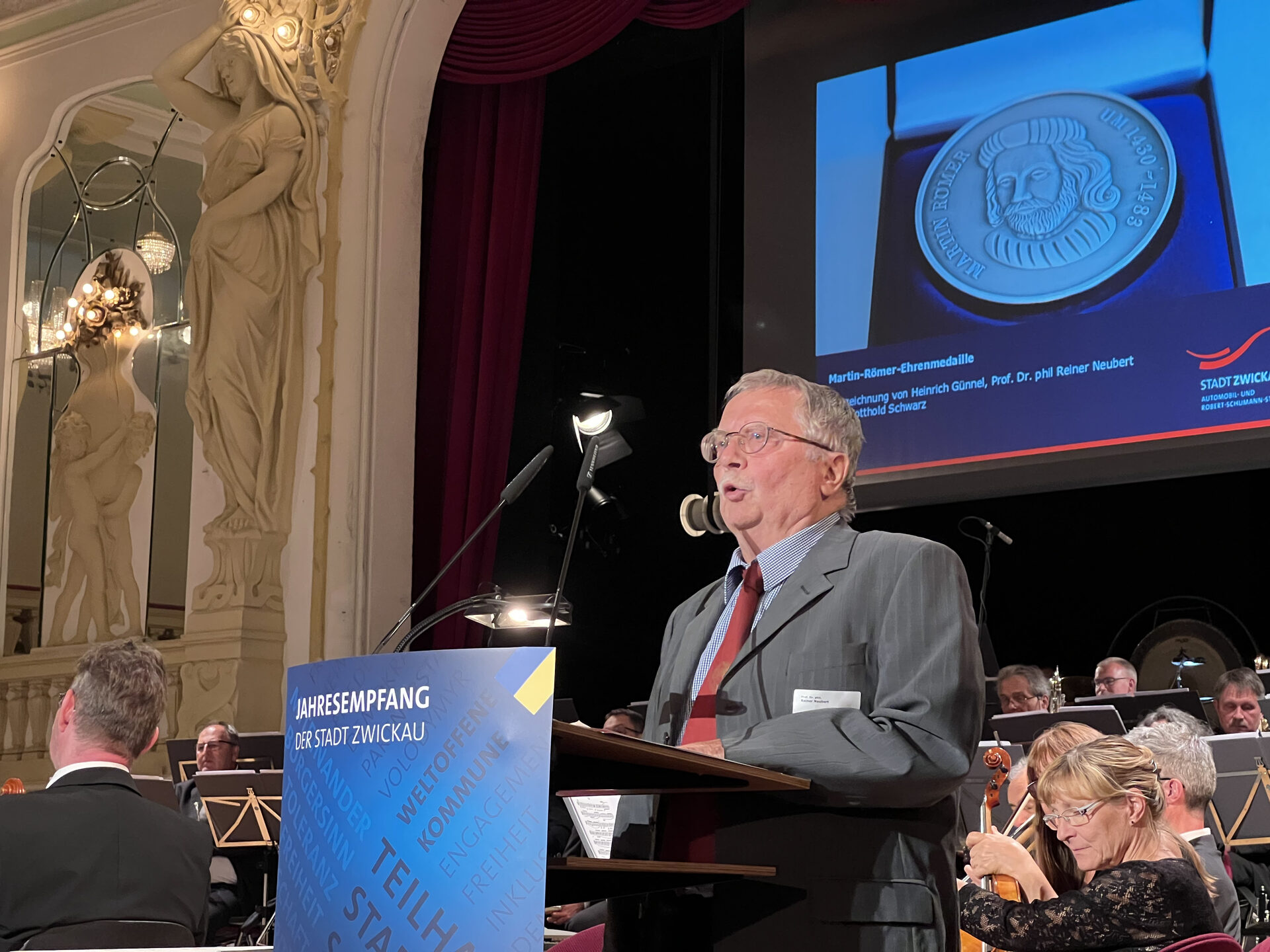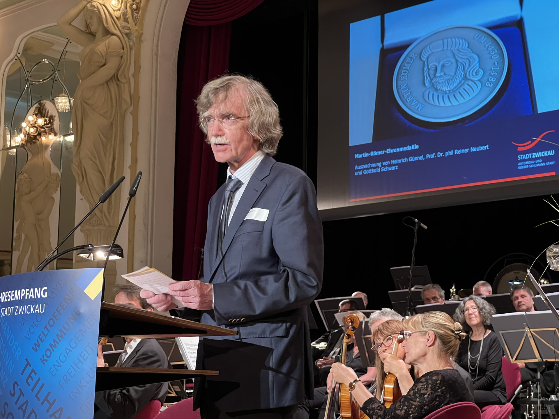 Prof. Dr. phil Reiner Neubert (Jahrgang 1942) beendete zunächst eine Schlosserlehre und absolvierte danach ein sogenanntes Werktätigenstudium für das Lehramt in Deutsch und Sport an der Pädagogischen Hochschule Zwickau, wo er ab der Promotion ab den 1970-er Jahren lehrte und 1989 zum Professor berufen wurde. In Folge der Auflösung der Zwickauer Hochschule wechselte er an die Universität Pilsen. Prof. Reiner Neubert engagierte und engagiert sich in seiner Heimatstadt Zwickau jahrzehntelang in den Bereichen von Bildung und Kultur. Beispielhaft sei auf die Gründung und Leitung des Deutsch-Tschechischen Literaturbüros an der Westsächsischen Hochschule Zwickau, die Organisation von Deutsch-Tschechischen Literaturtagen oder die Mitwirkung bei der Herausgabe der „Tschechischen Bibliothek in 33 Bänden“ (erschienen in der Deutschen Verlagsanstalt) hingewiesen. Besondere Erwähnung verdienen die ehrenamtlich angebotenen Lesungen, die Prof. Reiner Neubert seit 2003 in Zwickau durchführt. Gerade mit diesen wird ein Beitrag zum kulturellen Leben der Stadt und zum Verständnis der Kultur unseres Nachbarlandes geleistet.