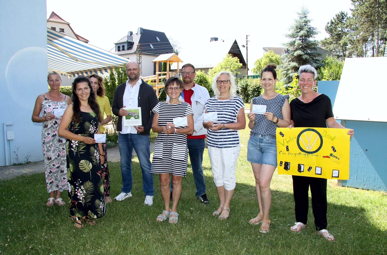 In der Kita „Am Wasserturm“ sorgten am Freitag - neben Kaiserwetter und Badespaß im Garten - vor allem zwei Herren für große Freude. Mike Rösler und Conny Wendte, beide vom Betriebsrat VW Sachsen GmbH, waren zu Besuch. Im Gepäck hatten sie Spendenschecks der VW-Restcentaktion, eine Aktion der Belegschaft der Volkswagen Sachsen GmbH, an der sich fast alle Mitarbeiterinnen und Mitarbeiter beteiligen und von ihrem Lohn den Betrag nach dem Komma spenden.