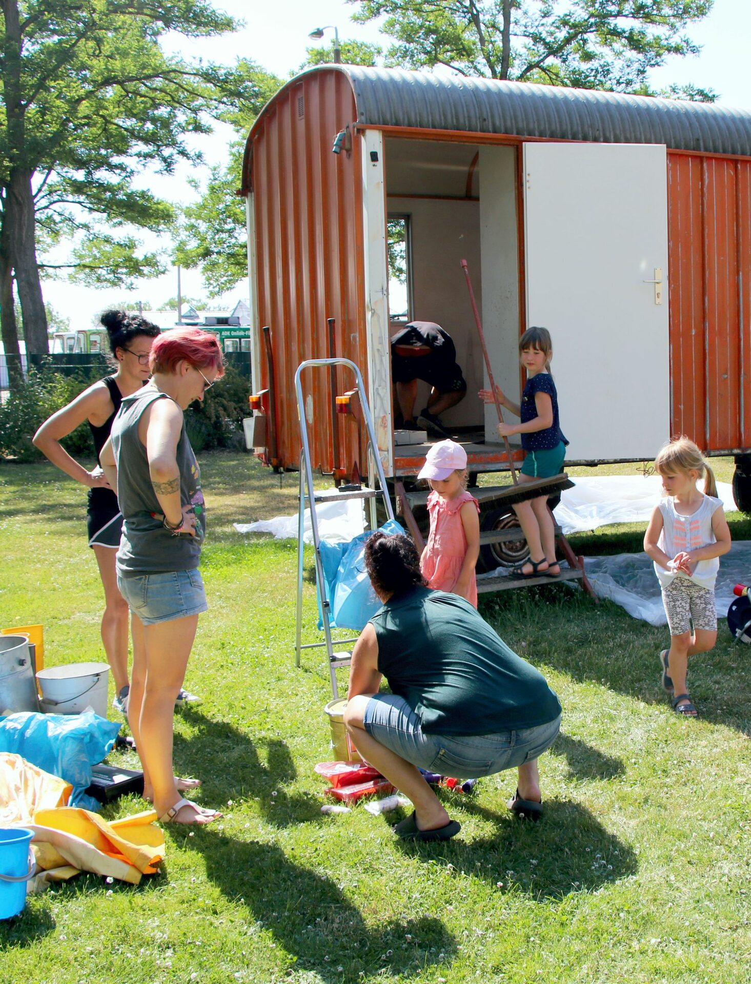 Noch gibt es allerhand zu tun, auch wenn er in einem recht guten Zustand ist und sogar funktionstüchtige Fensterläden hat. Vergangene Woche wurde schon mal entrümpelt, geputzt und gestrichen. Um eine liebvolle wie zweckmäßige Innenausstattung kümmern sich auch diesmal versierte Eltern der Krümelkiste, die zum Teil handwerkliche Berufe ausüben. Vorgesehen sind wieder zweckmäßige Stauräume für Decken, Klapptische, Hocker und verschiedene Forscherutensilien (z. B. Lupen, Schaufeln, Behältnisse).