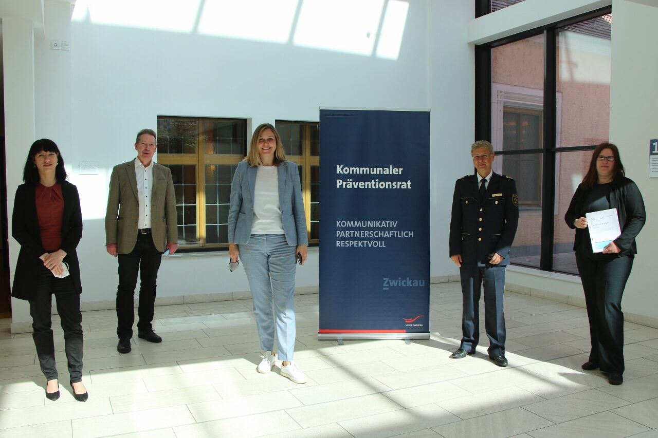 Anja Herold-Beckmann (Staatsministerium des Innern - Geschäftsstelle Landespräventionsrat), Jörg Feldmann (NKMG mbH), Oberbürgermeisterin Constance Arndt, Polizeipräsident Lutz Rodig und Nicola Niedernolte (Stabsstelle Kommunale Prävention, Stadtverwaltung Zwickau) stellten die Sicherheitsanalyse im Rathaus vor (v.l.n.r.).