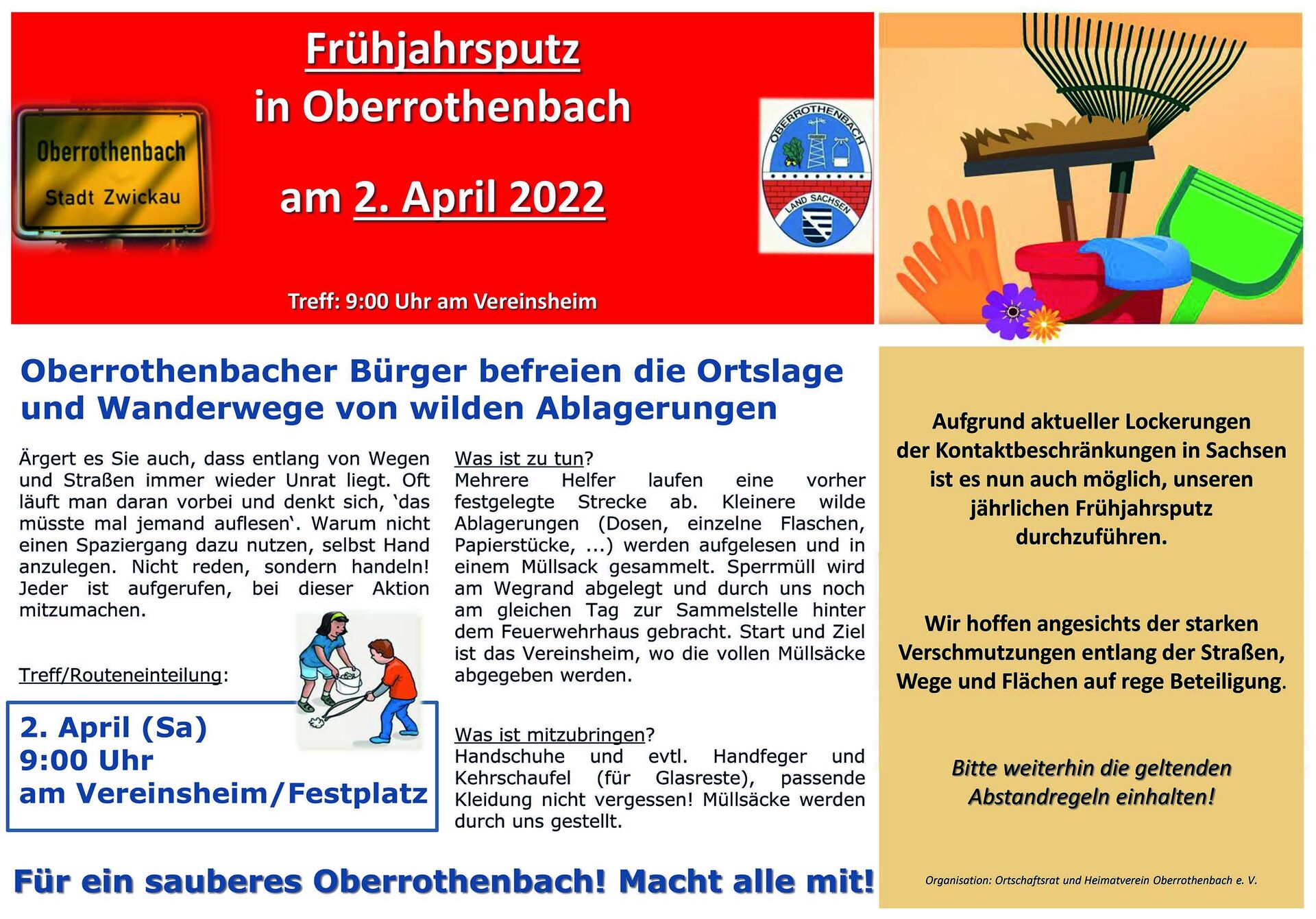 Der Ortschaftsrat und der Heimatverein Oberrothenbach laden insbesondere die Bürgerinnen und Bürger des Stadtteils zum gemeinsamen Frühjahrsputz ein. Dieser findet am kommenden Samstag, dem 2. April statt. Treffpunkt ist um 9 Uhr auf dem Festplatz beim Vereinsheim.