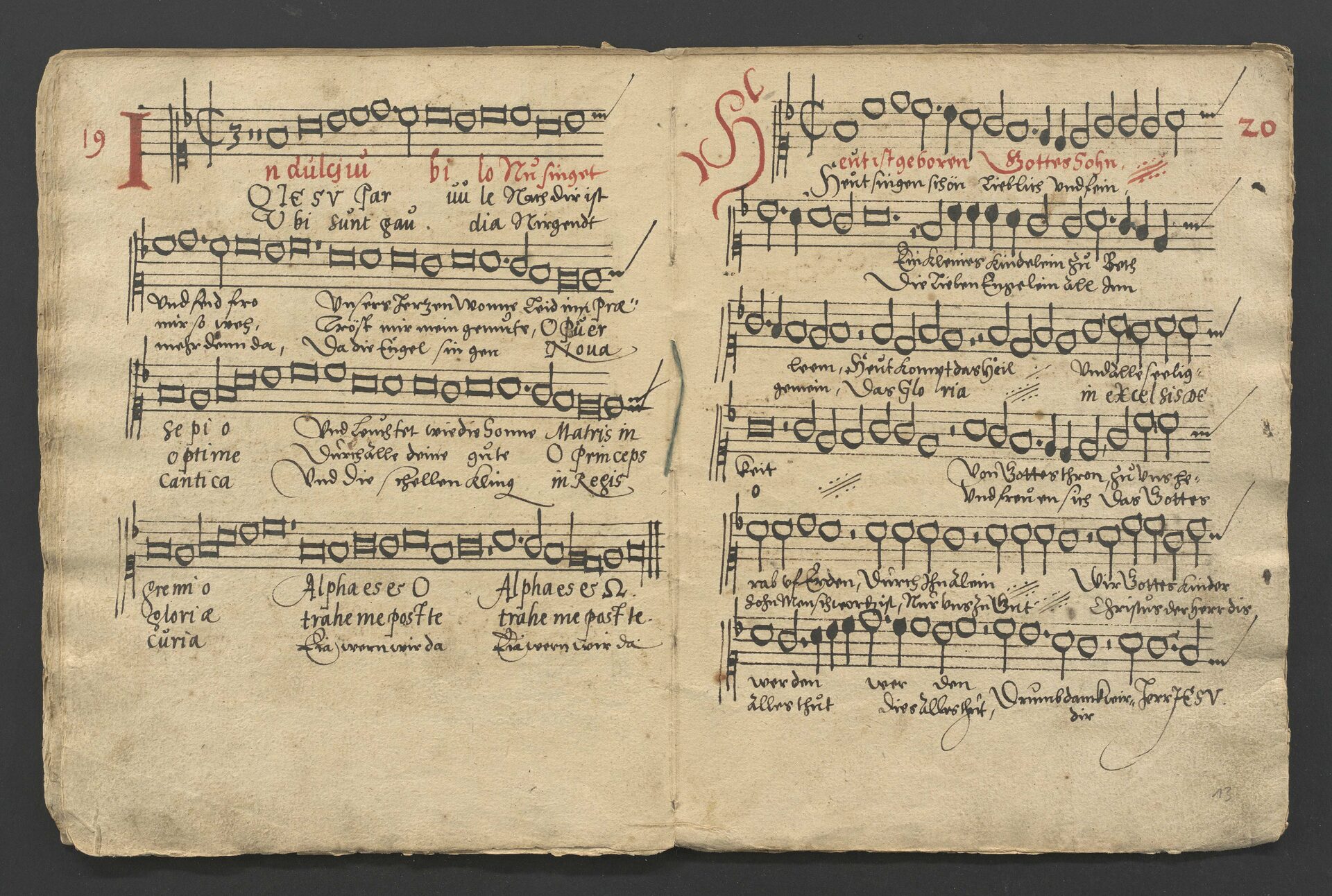 Der Scan zeigt die Cantusstimme von Nr. 19: Johann Walter, „In dulci jubilo“ und Nr. 20: Josquin Baston, „Heut ist geboren Gottes Sohn“ aus dem sogenannten „Weihnachtsliederbuch“ von Cornelius Freundt (um 1577). Die Handschrift enthält 28 Weihnachtsliedsätze (Quelle: Ratsschulbibliothek Zwickau)