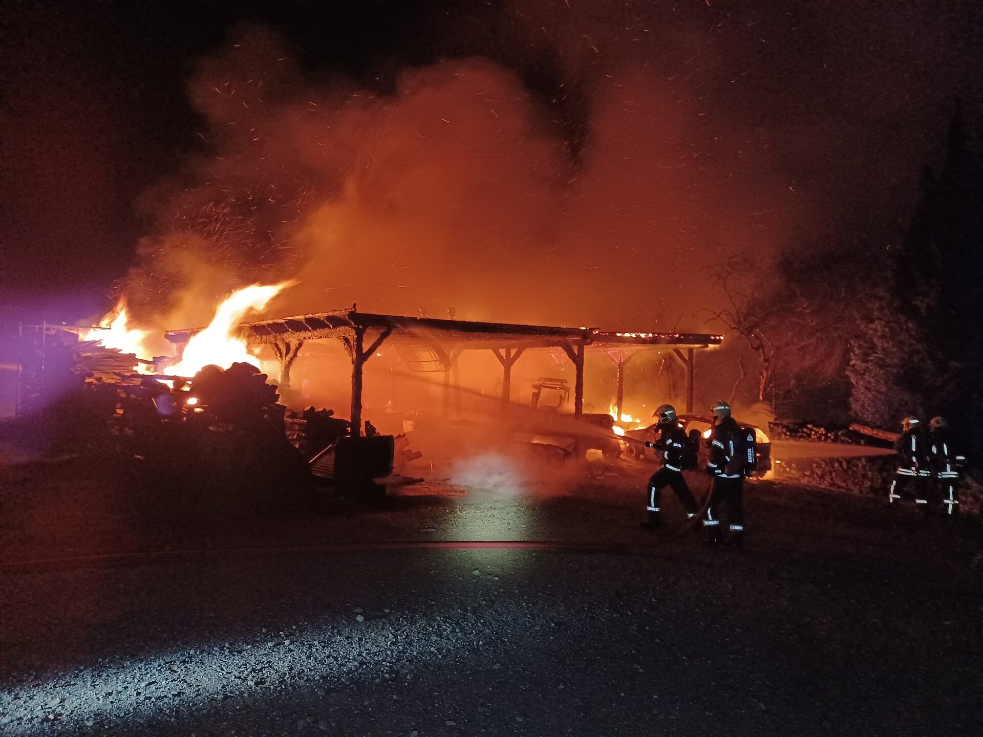 Am späten Freitagabend wurde über Notruf der Brand eines freistehenden Carports im Niederhohndorfer Querweg gemeldet. Der Einsatz wurde um 23:18 Uhr mit dem Einsatzstichwort BRAND_1 eröffnet. Aufgrund der Vielzahl von Notrufen wurde durch den Disponenten der Leitstelle das Einsatzstichwort 4 Minuten später auf BRAND_2 erhöht und weitere Einsatzkräfte nachalarmiert. Beim Eintreffen am Einsatzort brannte ein ca. 10 m x 15 m großer Carport mit darin befindlichen Fahrzeugen sowie angrenzendem Brennholz in voller Ausdehnung.