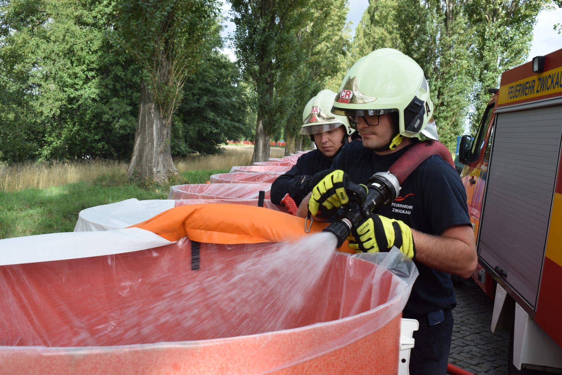 Ziel der Übung war vor allem, den Umgang mit den verschiedenen Systemen zu proben. Zudem wurde überprüft, wie lange der Aufbau dauert. Diese Einschätzung ist wichtig, um in Ernstfall rechtzeitig beginnen zu können. Eingesetzt wurden das Dammbalkensystem am Moritzbach sowie – zwischen Moseler Straße und 04-Bad – das Schlauchwallsystem. An der Crossener Straße wurde das Aquariwa-System aufgebaut. Befüllt wurden außerdem Sandsäcke, die dann auf dem Muldendamm vom Brückenplatz aus Richtung Park „Neue Welt“ verbaut wurden.