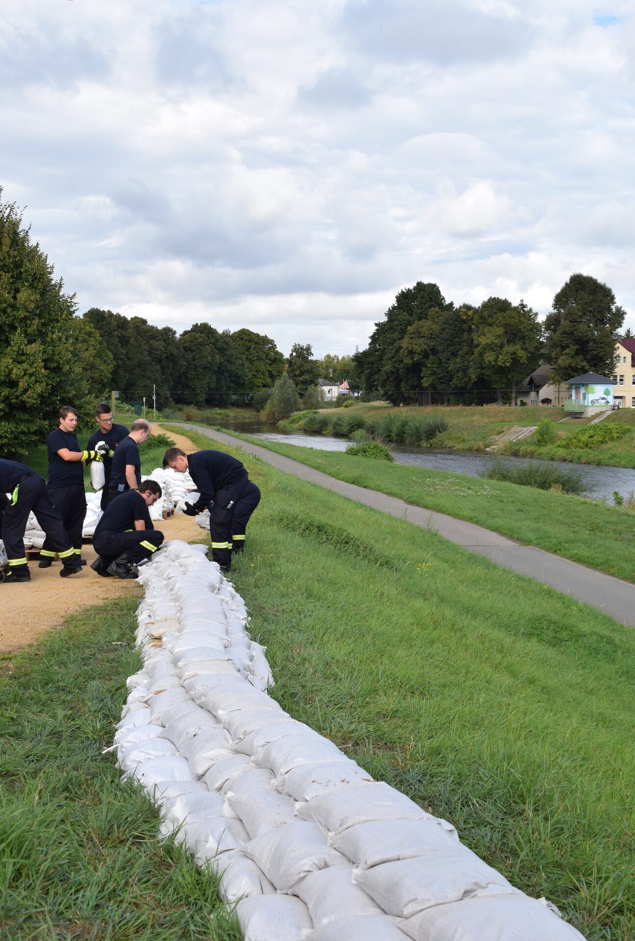 Etwa 150 Einsatzkräfte probten am heutigen Samstag den Aufbau verschiedener mobiler Hochwasserschutzsysteme. Nils Eichhorn, Leiter des Feuerwehramtes, zeigt sich in einem ersten Resümee zufrieden: „Alle Beteiligten haben gut und engagiert gearbeitet, der Aufbau der mobilen Systeme hat geklappt!“ Von der Übung hatte sich auch Oberbürgermeisterin Constance Arndt vor Ort einen Eindruck verschafft.