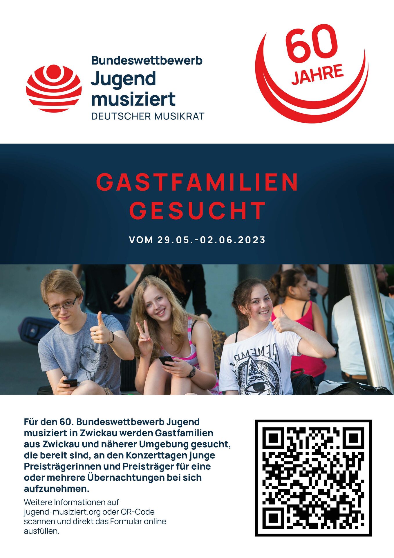 Vom 25. Mai bis 2. Juni findet der 60. Bundeswettbewerb Jugend musiziert statt. Die Wertungen und Konzerte finden an etwa 20 Veranstaltungsorten vor allem in Zwickau sowie in Reichenbach, Werdau und Meerane statt. Erwartet werden rund 2.500 junge Musiker. Hinzukommen Lehrkräfte, Eltern und zahlreiche Musikinteressierte. Die Deutsche Musikrat gGmbH als Organisator sucht nun Gastfamilien, Koordinationshelfer und Fahrer.