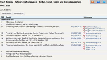 Die Förderung kultureller Einrichtungen und Maßnahmen im Jahr 2023 sowie die Förderung der freien Jugendhilfe und Wohlfahrtspflege sind zwei der Themen, mit denen sich die Mitglieder des Kultur-, Sozial-, Sport- und Bildungsausschusses in ihrer kommenden Sitzung beschäftigen. Diese findet am Donnerstag (9. März) um 16 Uhr im Rathaus statt. Weitere Beschlussvorlagen haben Zuschüsse für das Freibad Crossen, für den ESV Lok, die Wasserballer des SV Zwickau 04 und den VfB Eckersbach zum Inhalt.