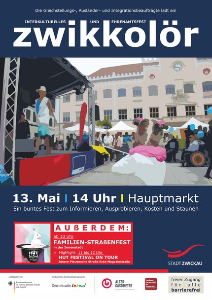 Nach vier Jahren Verzicht ist es endlich so weit: zwikkolör – DAS interkulturelle Fest in Zwickau kann wieder stattfinden! Am Samstag, dem 13. Mai lädt die Stadtverwaltung Zwickau gemeinsam mit lokalen wie regionalen Vereinen, Initiativen und Verbänden wieder zu einem vielfältig-unterhaltsamen und bunten Nachmittag für die ganze Familie auf den Hauptmarkt – und auch auf den Kornmarkt – ein!