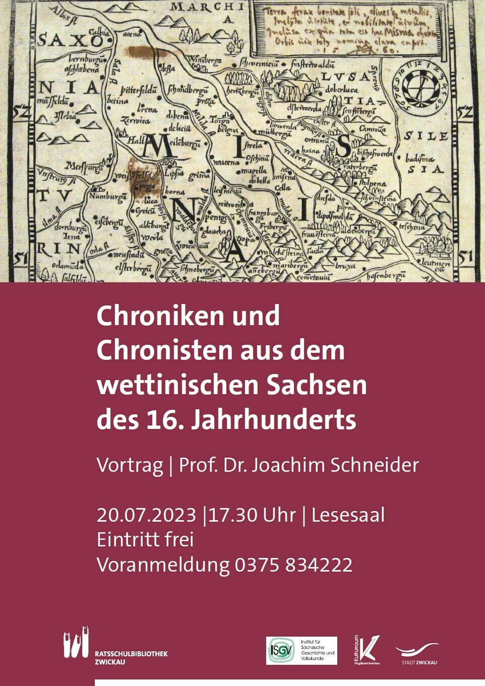 Die moderne Landesgeschichte hat zu vielen Themen ein umfangreiches Wissen erarbeitet. Bis dahin war es allerdings ein langer Weg. Die Anfänge der Geschichtsschreibung über Stadt und Land in Sachsen liegen im 16. Jahrhundert. Damals begannen Chronisten, Ereignisse ihrer Gegenwart als Zeitzeugen aufzuzeichnen, aber auch die Geschichte des Landes und seiner Städte bis zu ihren sagenhaften Anfängen zu erforschen. Anstoß dafür war eine allgemeine Bildungsexpansion im Gefolge von Humanismus und Reformation. Wettinische Landesherren und städtische Oberschichten haben diese Geschichtsschreibung gefördert. Der Vortrag stellt Beispiele vor und erläutert, was die Chronisten interessierte und welche Vorstellungen von Geschichte sie entwickelt und verbreitet haben. Prof. Schneider wird gesondert auf die Zwickauer Chronisten des 16. Jahrhunderts (Schumann, Greff, Tretwein) eingehen.