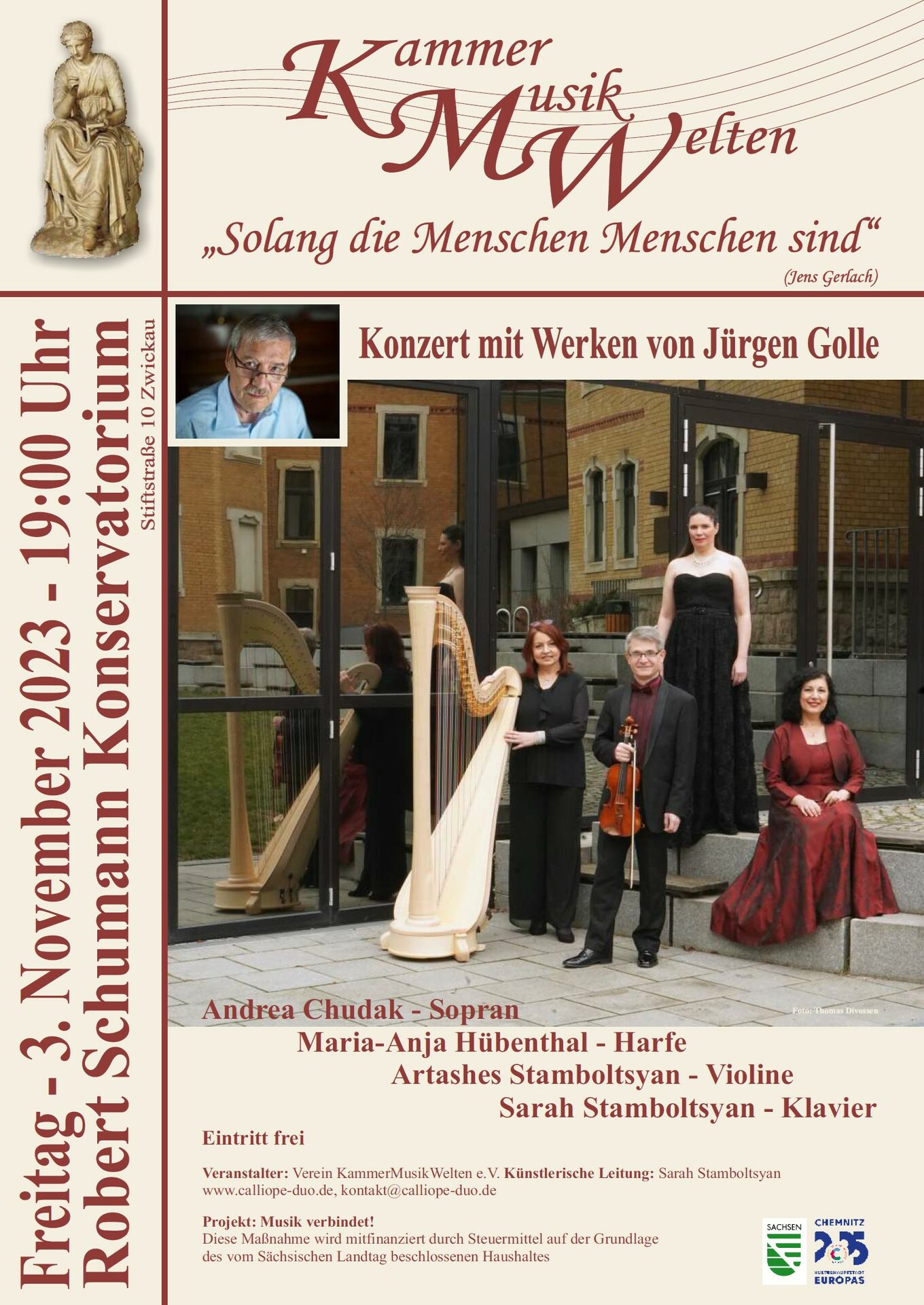 Am Freitag, 3. November 2023 findet unter dem Motto „Solang die Menschen Menschen sind” um 19 Uhr im Robert Schumann Konservatorium ein Konzert mit Werken des Zwickauer Komponisten Jürgen Golle statt. Dieses Konzert veranstaltet die künstlerische Leiterin des Vereins “KammerMusikWelten” e.V. Sarah Stamboltsyan: “Unser Ziel war ein Musikprojekt Wirklichkeit werden lassen, welches ein Stück Zwickauer Musikgeschichte mit den wunderbaren Werken von Jürgen Golle den Konzertbesuchern präsentiert”.