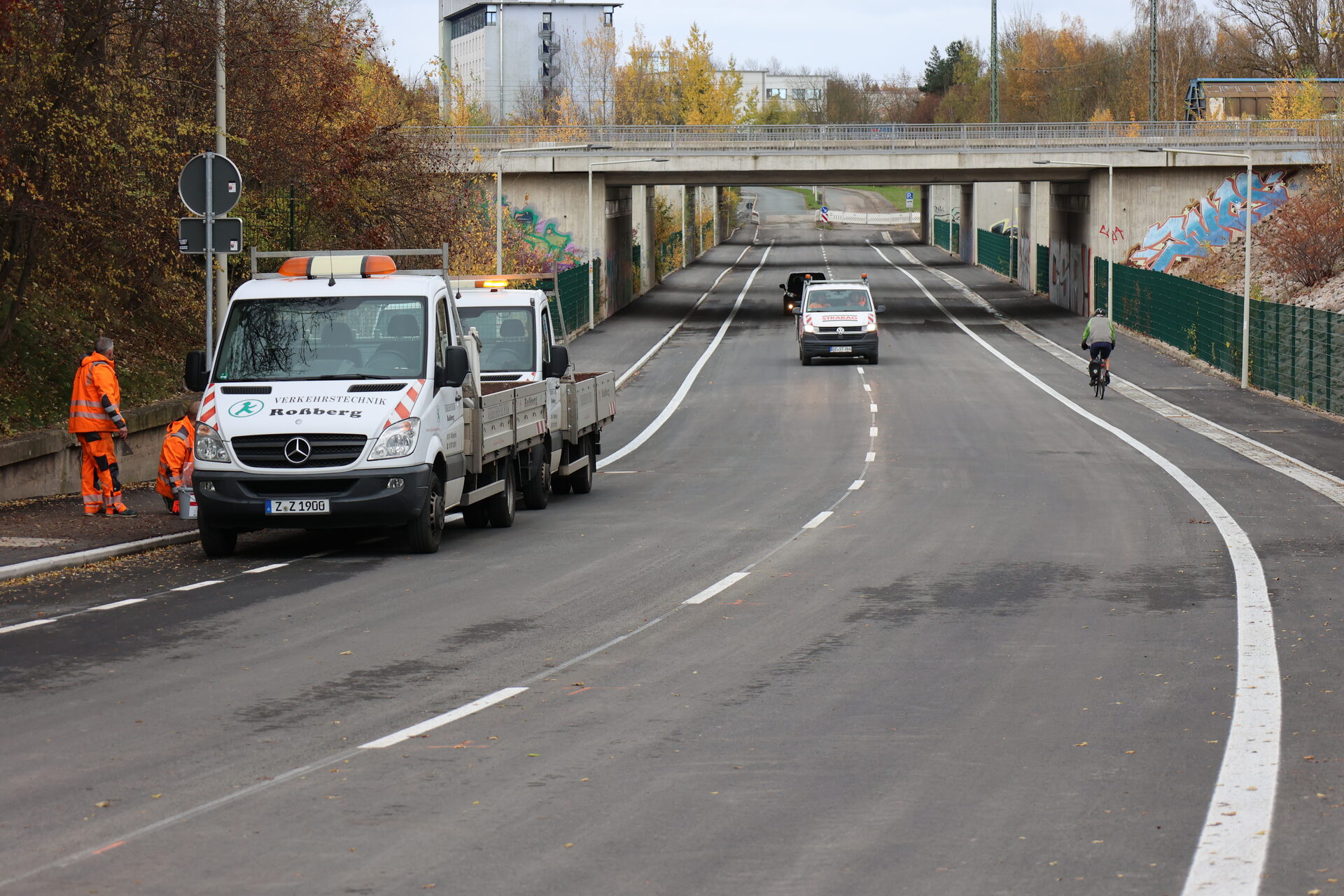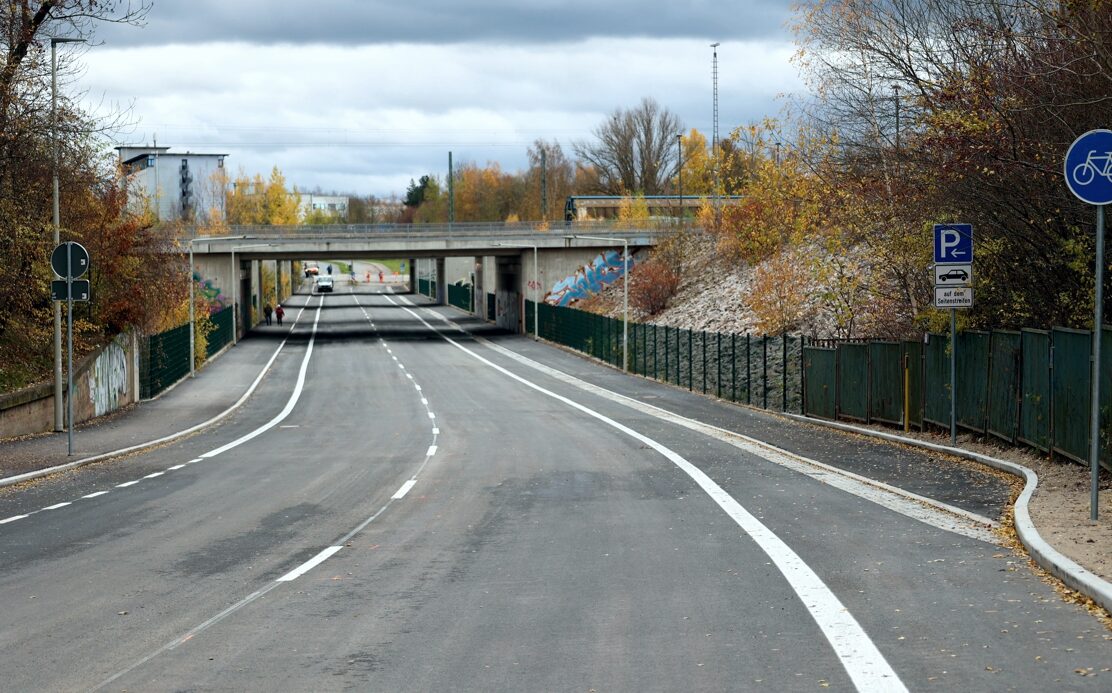 In den vergangenen knapp zwei Jahren wurde die Olzmannstraße in zwei großen Bauabschnitten erneuert. Der Straßenabschnitt zwischen Hofer Straße und Querung der ehem. Lehmbahn erhielt auf rund 1.100 Quadratmetern eine neue Asphaltschicht. Im Abschnitt zwischen ehem. Lehmbahn und der Brücke über den Mittelgrundbach wurde die komplette Straße grundhaft ausgebaut. Der Rückbau der Mittelstützen der Eisenbahnüberführung ermöglichte eine Neuordnung des verfügbaren Straßenraums. Durch die gewonnene Fläche stehen den Verkehrsteilnehmern nun auch Radfahrstreifen (1,85 m) bzw. Schutzstreifen (1,5 m) und in Höhe ehem. Lehmbahn eine Querungsstelle für Radfahrer zur Verfügung. Für den Verkehr aus Richtung Reichenbacher Straße kommend gibt es jetzt außerdem eine separate Linksabbiegespur in Richtung Zufahrtsstraße JVA. Ebenso neu ist ein einseitig angelegter, ca. 300 Meter langer Parkstreifen unter den Eisenbahnüberführungen.