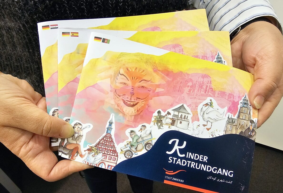 Seit gut einem Jahr können Kinder anhand einer farbenfroh gestalteten Broschüre mit dem Titel „Kinderstadtrundgang“ auf Entdeckertour durch die Zwickauer Innenstadt gehen. Das 48-seitige A5-Heft im Querformat, das kindgerecht über Sehenswürdigkeiten im Stadtzentrum informiert, wurde bereits in Deutsch/Englisch, Deutsch/Ukrainisch und Deutsch/Russisch aufgelegt und richtet sich vor allem an zugewanderte Kinder im Alter von 8 bis 12 Jahren.