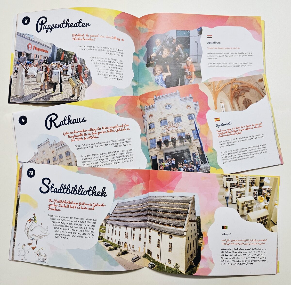 Jetzt gibt es drei weitere Ausführungen. Kinder, die mit ihren Eltern erst kürzlich nach Zwickau gezogen sind und die Stadt gerne kennenlernen möchten, können das Heft ab sofort auch in den Sprachvarianten Deutsch/Spanisch, Deutsch/Arabisch und Deutsch/Persisch erhalten. Die Broschüren mit einer Auflagenhöhe von jeweils 250 Exemplaren werden über die kommunalen Kitas und Jugendeinrichtungen, das Büro der Gleichstellungs-, Ausländer- und Integrationsbeauftragten und die Integrationsberatungsstelle ausgereicht. Gleiches betrifft auch die ersten Ausgaben in Englisch, Ukrainisch und Russisch. Die englische Version lief bisher am besten, wurde nachgedruckt und ist jetzt auch wieder verfügbar.